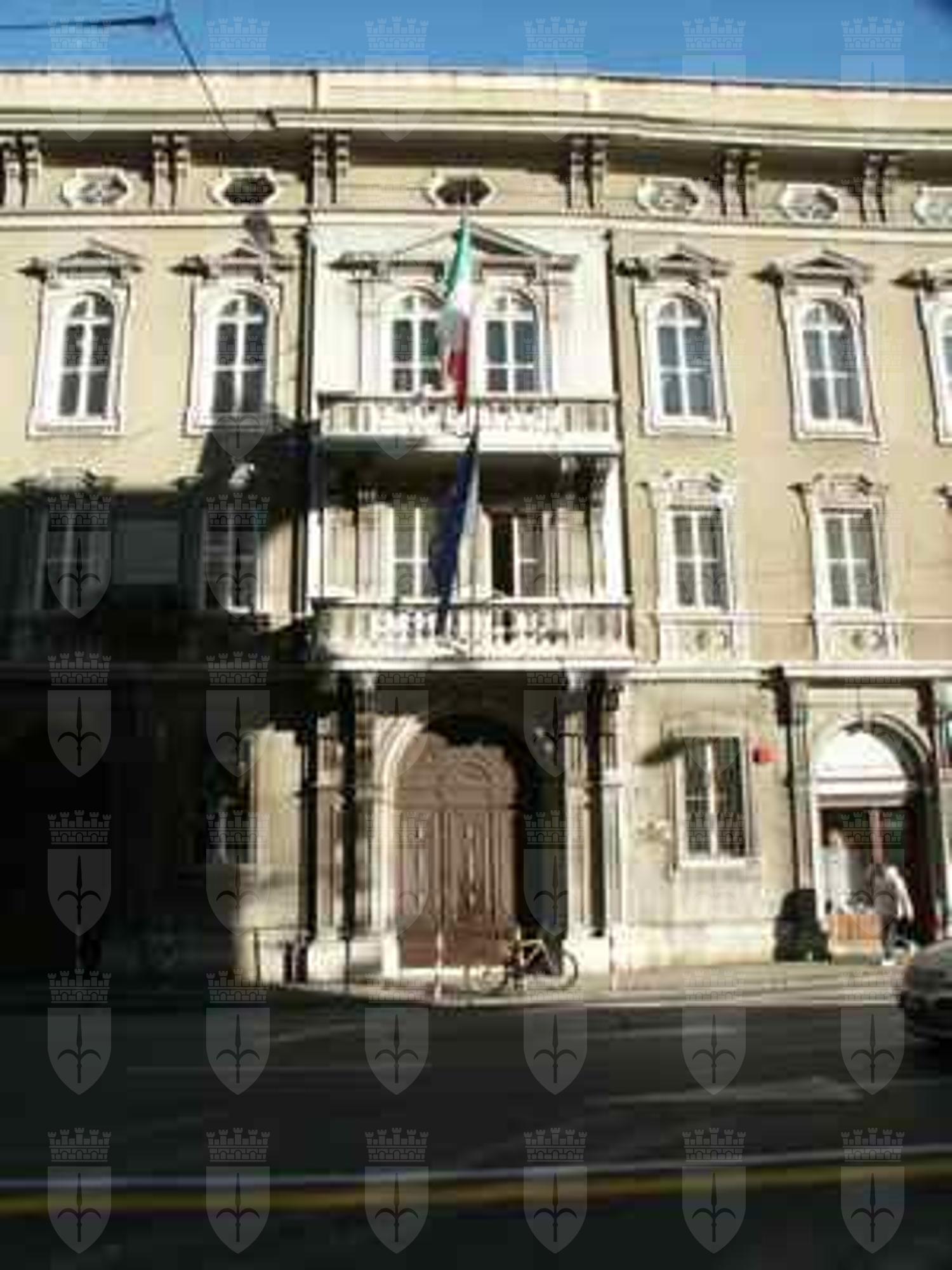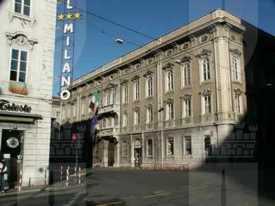Serramenti esterni tutti in legno, di diverse tipologie: al piano terra doppie finestre rettangolari a quattro specchiature con cornice in pietra bianca bulinata ed inferriata in ferro battuto; al primo piano doppie finestre rettangolari a quattro specchiature, con edicola in pietra bianca a decorazione del foro architettonico e motivo geometrico a rilievo nella specchiatura sotto il davanzale in pietra; al secondo piano doppie finestre arcuate a sei specchiature, decorate da cornice a rilievo in pietra bianca e timpano triangolare nella parte superiore; al terzo piano finestre metalliche singole ellittiche con cornice in pietra bianca sul fronte principale (PICT0027.JPG), doppie rettangolari in legno con apertura ad anta sui fronti secondari. Finestre tutte rettangolari in legno con cornice semplice in pietra sui fronti affacciati sul cortile interno. Al piano terra finestre rettangolari con serramenti oscuranti in legno a doghe incrociate in corrispondenza del Bar Tartini sulla via Martiri della Libertà. Portali al piano terra in legno massello intarsiato, incorniciati da edicole in pietra bianca di diversa fattura. Fori commerciali con ampie vetrate con telaio e cassonetto in ferro verniciato. Serramenti interni in acciaio verniciato nelle aule e nelle parti comuni; in legno massello intarsiato, con cornici in marmo scuro o legno in corrispondenza dei locali di rappresentanza. Edicola decorativa sulla facciata principale sviluppata a tutta altezza in corrispondenza dell'ingresso (PICT0039.JPG). Paraste in pietra binate con motivi geometrici a forma piramidale a lato del portale ligneo a sostegno di quattro mensoloni a voluta, posti a loro volta a sostegno del balcone con parapetto in pietra bianca e balaustrini a sezione circolare. Balcone al secondo piano con due finestre arcuate binate, decorate da edicola con timpano triangolare. Marcapiano a livello del solaio del quarto piano con semplici modanature a dentello rompigoccia; sporto di linda con banchina in pietra bianca sostenuto da mensole a voluta e decorato da una doppia modanatura ad ovuli sovrastata da dentelli rompigoccia. Pluviali in acciaio zincato esterni in facciata lato strada solo tra il solaio del primo e del terzo piano, sotto forma di colonnine posizionate secondo i ritmi di facciata. Sulle altre facciate, pluviali e gronde in ferro verniciato. Atrio d'ingresso con pavimento in marmo di Aurisina, delimitato da colonne marmoree con capitello corinzio, sovrastato da soffitto decorato da motivi geometrici a stucco. Vano scala principale di carattere monumentale (PICT0056.JPG), sovrastato da volta a padiglione decorata con motivi a stucco con lucernario vetrato a specchiature rettangolari e lampadario a candelabro in ferro battuto; gradini in pietra bianca bulinata sostenuto da colonnine in marmo rosso con capitello corinzio e parapetto in pietra bianca con corrimano in ottone lucido recentemente applicato; pareti decorate con specchiature in spatolato alla veneziana e cornici in stucco. Pavimento intarsiato a motivi geometrici in marmo bianco, rosso e nero in corrispondenza dei pianerottoli. Anfore in pietra bianca ad uso fioriera a decorazione del parapetto dell'ultimo livello della scala. Vano scala secondario di tipo appoggiato con gradini in pietra bianca bulinata, pianerottoli in pietra d'Aurisina tipo "fiorita", parapetto in ferro verniciato con motivi a voluta e corrimano in legno. Scala di accesso al terzo piano di tipo appoggiato in calcestruzzo armato, con gradini rivestiti in pietra d'Aurisina tipo "fiorita", parapetto in ferro verniciato a bacchette verticali e corrimano in legno. Scala esterna di accesso all'appartamento del custode, di tipo a mensola, con gradini in pietra bianca, parapetto in ferro verniciato decorato a volute. Baldacchino in ferro verniciato a protezione della porta d'ingresso all'alloggio con copertura a due falde inclinate e gronda di raccolta acque meteoriche (PICT0031.JPG). Aula magna in stile barocco con volta a padiglione decorata da motivi a stucco e pietra bianca, ampie superfici specchiate, pavimento in legno intarsiato a motivi geometrici, lampadari e candelabri a parete con pendagli in cristallo e tendaggi in velluto pesante di colore scuro. Ampliamento con struttura in telaio di acciaio zincato e serramenti in alluminio verniciato colore marrone, vetrati a tutta altezza, suddivisi in specchiature rettangolari, formante nell'area centrale un patio rettangolare trattato a giardino. Nelle parti rinnovate, pavimenti in quadroni di linoleum, controsoffitti in listoni di alluminio, illuminazione a mezzo di lampade al neon. Nelle aule dell'ultimo piano, controsoffitti in cartongesso o pannelli eraclit.