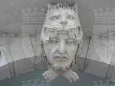 PANDURO (esterno) Il panduro collocato in chiave d'arco della Portizza raffigura un Ercole incappucciato da una testa di leone, con le zampe incrociate sotto al mento BASSORILIEVI (esterno) Un fregio a bassorilievo con motivi vegetali e allegorici corona la parte superiore del tetto. Le Lunette delle finestre del primo piano sono decorate con dei motivi allegorici a bassorilievo.