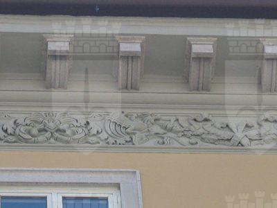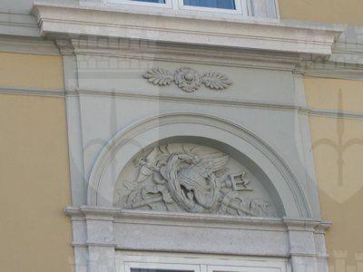 PANDURO (esterno) Il panduro collocato in chiave d'arco della Portizza raffigura un Ercole incappucciato da una testa di leone, con le zampe incrociate sotto al mento BASSORILIEVI (esterno) Un fregio a bassorilievo con motivi vegetali e allegorici corona la parte superiore del tetto. Le Lunette delle finestre del primo piano sono decorate con dei motivi allegorici a bassorilievo.