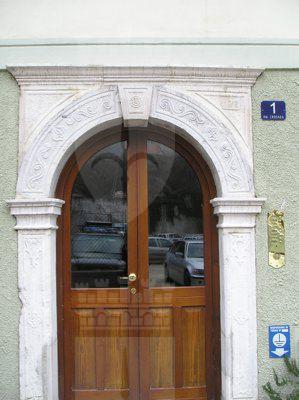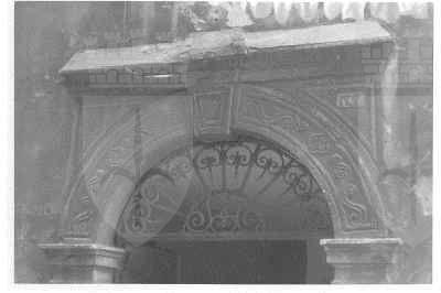 ELEMENTI ORNAMENTALI (esterno) Il portale ad arco presenta decorazioni a rilevo con motivi vegetali e floreali. In chiave d'arco è scolpita una rosellina. Sui pilastri che sostengono l'arco sono raffigurati motivi a scudo araldico e fiori.