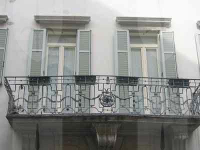 VOLUTE (esterno): Volute in pietra collocate in chiave di volta del portale principale e a sostegno del balcone soprastante. BALCONE (esterno): Balcone con parapetto in ferro battuto con decorazioni geometriche.