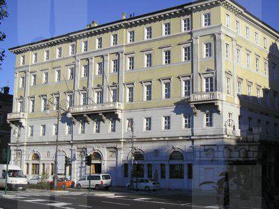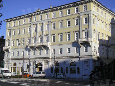 L'edificio venne realizzato nel 1839 su progetto dell'architetto Giovanni Degasperi, sul sito in cui sorgeva l'antica Cappella Rossetti. In origine intitolato al principe Metternich, assunse il nome di Hôtel de la Ville solo nel 1871. L'albergo, inaugurato il 1° giugno del 1841, ospitò personaggi importanti, come conti, ambasciatori, artisti, tra cui Giuseppe Verdi nel 1850, il re Ottone di Grecia nel 1858, fino a Gabrile D'Annunzio nel 1902. L'albergo era dotato anche di bagni pubblici, di acqua dolce, del Grande Ristorante con vista sul mare e del Cafè Divan, aperto nel 1839. Al 1860 risalgono i rettangoli scolpiti a bassorilievo sul pianterreno rappresentanti una decina di figure allegoriche, opera degli scultori Giuseppe Moscotto e Giovanni Depaul. Tale decorazione voluta dal mecenate Pasquale Revoltella si affiancava alla serie di tondi a rilievo dello scultore Pietro Zadomeneghi. Nel 1888 vennero apportate delle modifiche al pianoterra. Lavori di ristrutturazione generale interessarono l'edificio negli anni Ottanta del secolo scorso. Nel 1911 l'albergo venne acquistato dall'Unione Austriaca di Navigazione. L'edificio venne ristrutturato nel 1932 dall'architetto Gustavo Pulitzer Finali e nel 1955 dall'architetto Rutter. Rimase in esercizio fino al 1975; in seguito venne risistemato sotto la direzione dell'ingegnere Marino Bolaffio. Dal 1985 al 2004 gli ambienti del pianoterra sono stati occupati dalla sede della Banca Popolare di Novara.