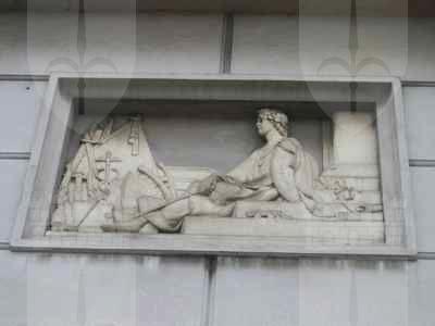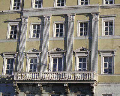 BALAUSTRA (esterno): Balcone con parapetto a balaustre ad anfora in corrispondenza delle parti aggettanti del primo piano. PARASTE (esterno): Paraste scanalate di ordine tuscanico tra primo e secondo piano in corrispondenza delle parti aggettanti. RILIEVI (esterno): Tondi decorativi raffiguranti le parti del mondo, opera di Pietro Zandomeneghi. Rettangoli scolpiti a bassorilievo da Giuseppe Moscotto e Giovanni Depaul rappresentano l'Onore, l'Industria, la Navigazione, la Riflessione, la Religione, la Costanza, la Beneficenza e il Commercio. I rilievi sono collocati negli spazi tra i fori architettonici del pianoterra.