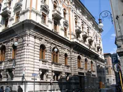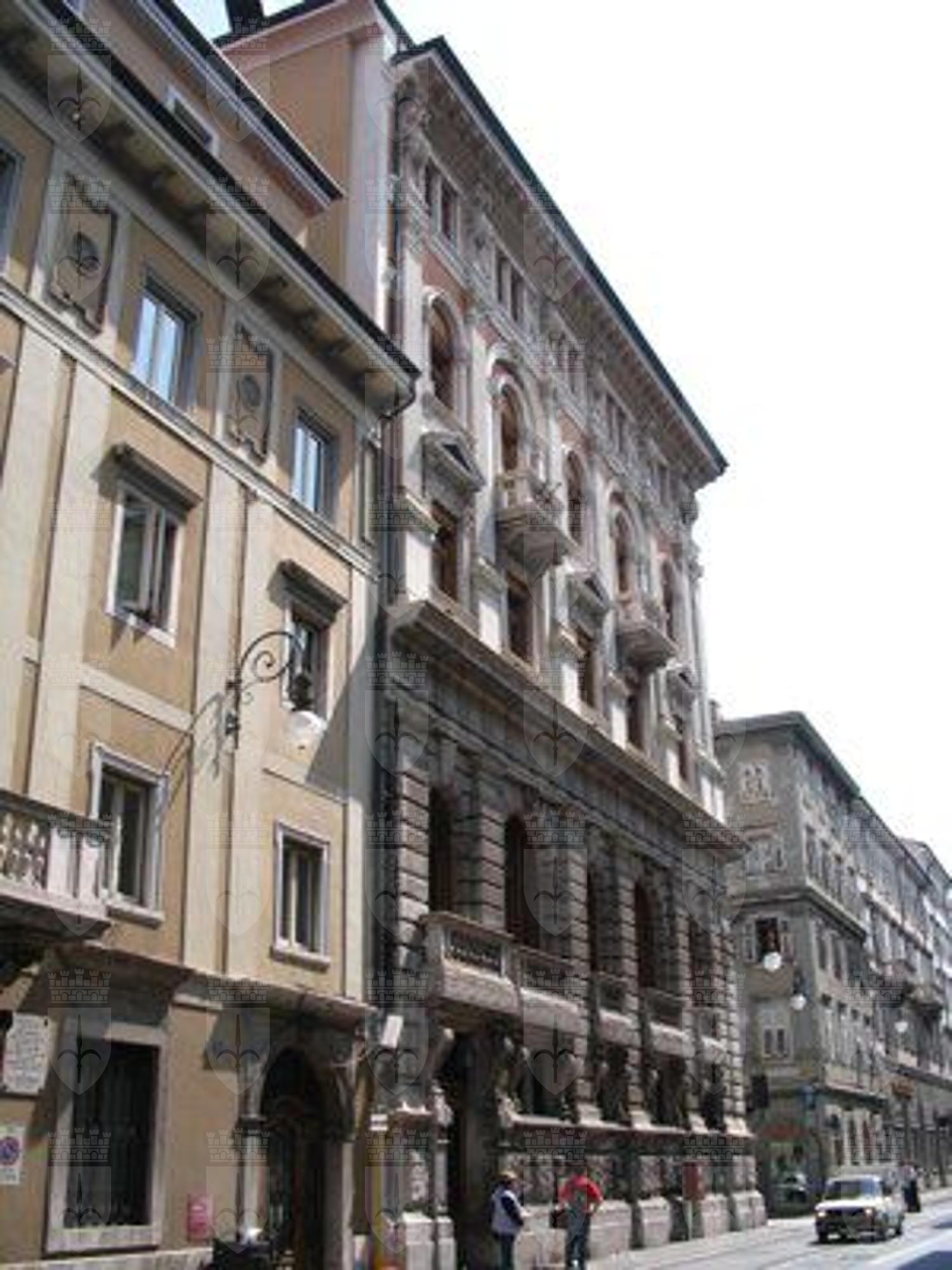 ISCRIZIONE (esterno) Sul parapetto del balcone del secondo piano della facciata principale è collocata l'iscrizione "CASSA DI RISPARMIO TRIESTINA" STEMMA (esterno) Sopra il portale d'ingresso stemma ovale con ape a rilievo e il motto "Lavora Raccogli Aumenta". ELEMENTI ORNAMENTALI (esterno) Riquadri decorativi con motivi geometrici e a nastri in corrispondenza delle specchiature tra i fori dell'ultimo piano. Motivi decorativi a greca alla base dei balconcini del primo piano. MENSOLE (esterno) Mensole a voluta in pietra bianca con testa d'uomo al quarto piano, con zampe e testa leonina al primo piano. Mensole a voluta in pietra bianca con motivo vegetale a sostegno dello sporto di linda e dei balconcini dei piani superiori. PANDURI (esterno) Mascheroni raffiguranti volto umano in chiave di volta in corrispondenza di alcune aperture del primo piano. LESENE (esterno) Lesene scanalate, rifinite a intonaco, con capitello corinzio a livello del secondo e terzo piano. SEMICOLONNE (esterno) Semicolonne scanalate, rifinite a intonaco, con capitello corinzio a livello del secondo e terzo piano del riquadro centrale della facciata principale. BALAUSTRE (esterno) Tutti i balconi sono ornati da balaustre in pietra con balaustrini ad anfora e pilastri angolari.