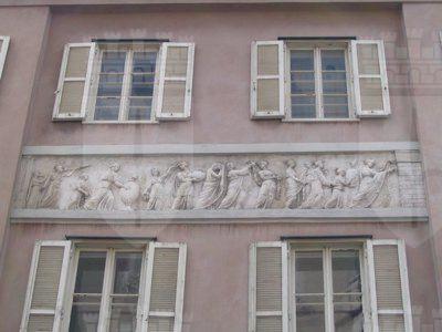 FREGI (esterno) I pannelli a bassorilievo raffigurano temi classici tratti dal repertorio antico quali baccanali, are sacrificali, cortei di suonatori e personaggi tratti dalla mitologia. BALAUSTRE (estreno) Su tutte le facciate la continuità della fascia marcapiano è spezzata da balaustre in ferro battuto a creare dei finti balconi. LESENE (esterno) Sul prospetto prospiciente via Roma sono presenti lesene lisce di ordine gigante con capitello ionico all'altezza del terzo e quarto livello