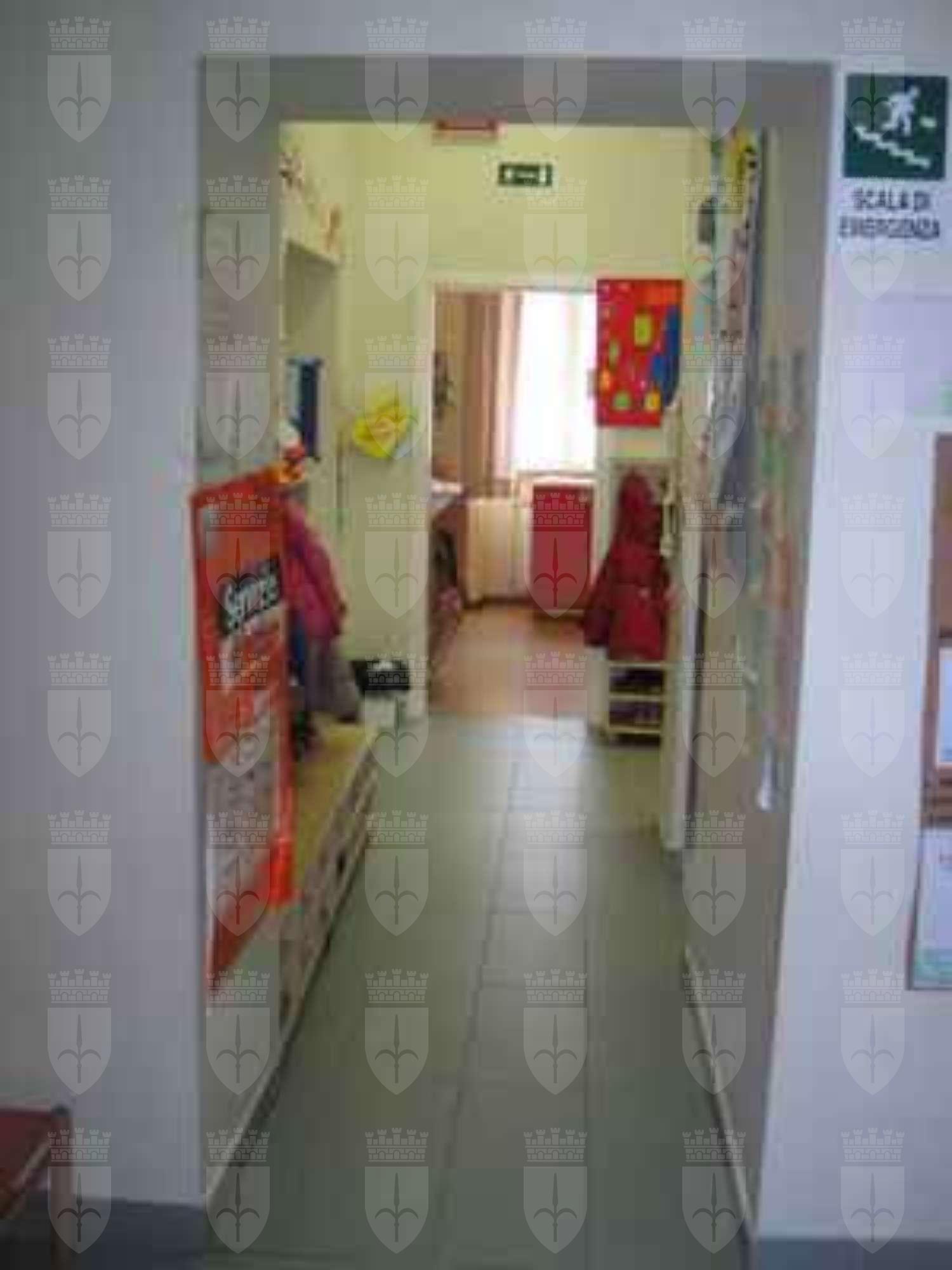 Fascia basamentale trattata a finto bugnato liscio a corsi orizzontali e tinteggiatato color grigio. Facciata interamente intonacata e tinteggiata color verde pastello, spezzata da due marcapiani modanati in pietra bianca e una cornice a fascia continua in pietra calcarea bianca posta tra i fori del terzo livello e la linda. Tra la cornice e la linda tredici anelli modanati in pietra bianca (IMG_0985). Volume secondario interamente intonacato e tinteggiato color verde pastello. L'accesso è garantito da una scala con gradini in pietra bianca bulinata che termina in un pianerottolo in lastre di pietra arenaria. Giardino retrostante pavimentato in lastre di pietra arenaria; giardino antistante in lastre grezze di pietra arenaria. Serramenti in alluminio color bianco a due specchiature con, al secondo e terzo livello, sopraluce. Nella fascia basamentale il foro che dà sulla scala presenta un'inferriata in ferro battuto. Fori del secondo e terzo livello ad arco con cornice in pietra bianca. Nel fabbricato secondario fori del primo livello rettangolari, di cui solo uno con cornice in pietra c Calcarea bianca. Al livello superiore fori ad arco con cornice in pietra bianca. Superiormente un foro orbicolare con cornice in pietra bianca e serramenti a due specchiature. Portone d'ingresso su Via dell'Asilo in ferro a due battenti (IMG_0965). Accesso all'edificio tramite una porta in alluminio color bianco a due battenti. Accesso al piano inferiore del fabbricato secondario con portoncino in alluminio verniciato grigio. Linda in calcestruzzo. Grondaia e pluviali esterni in lamiera verniciata color marrone. All'interno corridoi e servizi pavimentati con piastrelle (IMG_0975); aule e mensa con linoleum (IMG_0976). Scala in pietra bianca bulinata retta da volte in pietra (IMG_0972). Trave in acciaio a sostenere lo sbalzo delle rampe. Parapetto in ferro battuto con corrimano in legno.