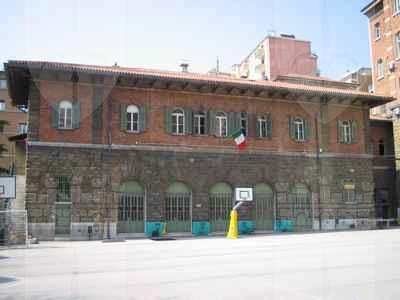 FABBRICATO PRINCIPALE Basamento in pietra bianca bulinata. Fascia superiore in bugnato a conci di pietra arenaria. Un marcapiano modanato in pietra bianca, che sovrasta un fregio continuo dentellato, segna la divisione dal resto della facciata. Essa è interamente rivestita in mattoni faccia a vista con alcuni elementi in pietra bianca a marcare le paraste. Elementi in pietra bianca inseriti anche tra gli archi ribassati dei fori dell'ultimo piano. Facciata su Via Ressel cieca. Parapetti delle due terrazze su Via Combi in pietra bianca. Banchina in pietra retta da coppie di reggimensole lavorate a volute, emergenti da un doppio fregio continuo dentellato. Bocche di lupo con inferriate nel basamento. Primi due livelli con fori arcuati a tutto sesto con serramenti in legno verniciato color bianco a nove o undici specchiature. Al primo livello due fori di dimensioni più ridotte a lato del portone sul cortile e nei volumi laterali: serramenti sempre lignei verniciati color bianco a cinque o tre specchiature. Al secondo livello di Via Combi doppi serramenti nel corpo centrale. Nel corpo laterale destro due bifore con serramenti in legno a tre specchiature. I restanti tre livelli hanno fori ad arco ribassato con davanzale e chiave di volte in pietra bianca; doppi serramenti in legno verniciato color bianco a undici specchiature. Nei corpi laterali che si affacciano sul cortile trifore e quadriforme con serramenti in legno a tre specchiature. Nel corpo laterale sinistro fori arcuati a tutto sesto o ad arco ribassato con serramenti lignei a tre specchiature. Portoni d'ingresso lignei a due battenti ciascuno e sopraluce. I fori arcuati sono tutti con cornice in pietra bianca modanata e pensilina sovrastante in legno che poggia su due reggimensole a volute in pietra bianca (IMG_1019). Gronda e pluviali esterni in lamiera. Doppio accesso su Via Combi. Corridoi pavimentati alla veneziana; aule con pavimenti in listelli di legno oppure con linoleum e controsoffitti in doghe d'alluminio. Corridoi occasionalmente inframmezzati da pareti lignee (IMG_1049). Scale nei corpi laterali. Sono di tipo appoggiato con trave d'acciaio di sostegno. Gradini in pietra bianca bulinata. Parapetto in ferro verniciato color bianco con passamano in legno (IMG_1046). RICREATORIO Basamento in pietra bianca bulinata. Fascia superiore in bugnato a conci di pietra arenaria. Rimanente parte di facciata rivestita in mattoni faccia a vista con conci di pietra arenaria a marcare gli spigoli del fabbricato. Scala laterale di accesso diretto al primo livello in pietra bianca bulinata con parapetto interamente in ferro. Facciata su Via Ressel cieca con solo sei piccoli fori rettangolari di recente fattura con serramenti in alluminio a unica specchiatura. Primo livello con fori arcuati a tutto sesto con serramenti in ferro verniciato color verde e sopraluce; inoltre fori rettangolari con serramenti in legno verniciato color verde a due specchiature con inferriate verniciate color verde. Una porta in ferro permette l'accesso al primo livello. Fori arcuati a tutto sesto nella struttura della scala con serramenti in legno a quattro specchiature o tamponati da assi di legno. Nel raccordo di collegamento con l'edificio principale fori rettangolari tamponati da tavolati dipinti. Secondo livello con fori arcuati a tutto sesto con davanzale in pietra bianca. Doppi serramenti in legno color bianco a quattro specchiature e sopraluce, la maggior parte dei quali provvista di oscuranti in legno verniciati color verde. Scala interna rivestita di linoleum antiscivolo con parapetto in ferro color verde. Corridoi, stanze e aule gioco pavimentate con quadrettoni di linoleum; controsoffitti costituiti da pannelli di fibre minerali. Palestra del livello inferiore con superficie in parquet.