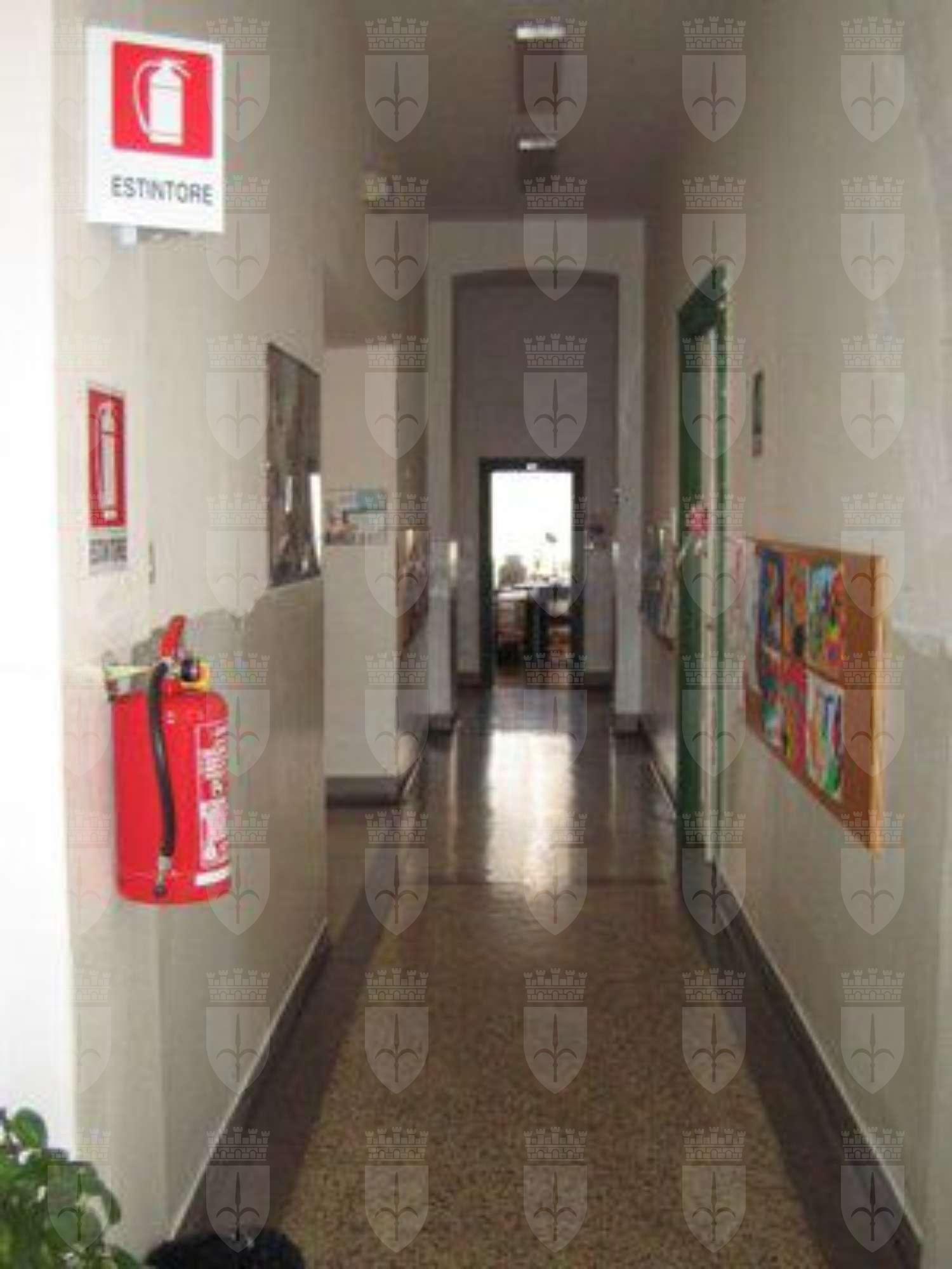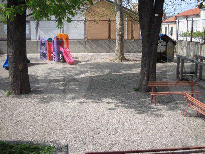 Fascia basamentale trattata a intonaco tinteggiato di grigio. La restante parte delle facciate è intonacata e tinteggiata color rosa; al primo livello è presente un intonaco bugnato liscio a corsi orizzontali. Lesene intonacate in leggero aggetto, tinteggiate in colore grigio e finite con stilature orizzontali. Un marcapiano modanato intonacato separa il primo dal secondo livello; due cornici sono poste all'altezza dei davanzali dei fori del secondo e terzo livello. Al di sotto della banchina, in pietra arenaria intonacata, è presente una fascia di coronamento in intonaco decorata da semplici motivi geometrici. Fori architettonici con cornice in pietra bianca bulinata e gocciolatoio ai primi due livelli; cornice modanata in pietra bianca bulinata al terzo livello. Al primo livello fori protetti da grate in ferro o resi ciechi con tavole di legno. Ulteriori gocciolatoi in lamiera al secondo livello. Foro del portone d'ingresso con cornice in pietra bianca bulinata, architrave e gocciolatoio modanato sostenuto da due reggimensole. Tutti i serramenti sono in PVC color bianco a due specchiature e sopraluce; fanno eccezione i fori del vano scale in vetrocemento. Portone d'ingresso ligneo a due battenti con sopraluce protetto da inferriata. La struttura della doppia rampa è in pietra arenaria a vista con gradini in pietra bianca bulinata e parapetto in ferro. Gronda e pluviali esterni in lamiera verniciata color bianco. Muro perimetrale in pietra arenaria e cemento con portone e parapetti in ferro verniciato color rosso. Giardino pavimentato con ghiaia (IMG_1176). Atrio d'ingresso e corridoi con pavimento alla veneziana. Aule gioco e uffici pavimentate con listelli di legno; mensa con linoleum; locali del sottoscala e cucine con piastrelle; sottotetto con tavoloni di legno e mattonelle. Scala appoggiata con gradini in pietra bianca bulinata (IMG_1170) rivestiti in alcune rampe con materiale plastico antiscivolo. Putrella in ferro di supporto. Parapetto in ferro verniciato di color verde e passamano in legno.