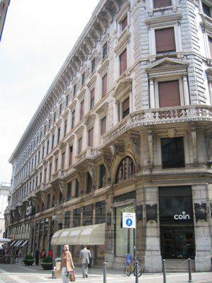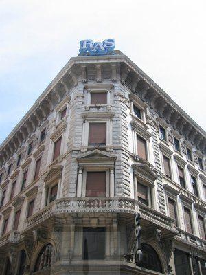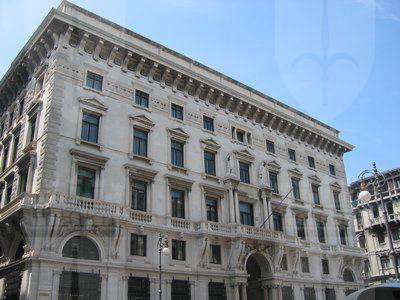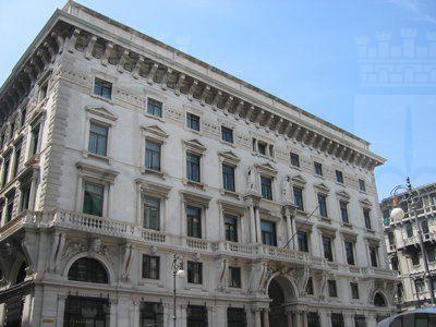 Il palazzo viene realizzato tra il 1909 ed il 1914 per ospitare la sede della Riunione Adriatica di Sicurtà su progetto degli architetti Ruggero ed Arduino Berlam. I problemi relativi all'ideazione dell'edificio sono abbastanza complessi: dalla scelta del terreno per la nuova sede, all'idea di bandire un concorso per il progetto fino alla realizzazione. Nel 1902 Adolfo de Frigyessy, direttore della Compagnia dal 1899, decide acquistare un'area centrale della città tra via Dante Alighieri, Santa Caterina, Corso Italia e piazza Nuova, oggi piazza della Repubblica. Sette anni dopo la società bandisce un concorso ad inviti per il progetto dell'edificio al quale partecipano dieci concorrenti; Ruggero ed Arduino Berlam si aggiudicano l'incarico con un disegno scenografico e monumentale arricchito da sculture e oggetti di design per l'allestimento interno. L'edificio viene arretrato di alcuni metri rispetto alle vecchie costruzioni permettendo una maggiore possibilità di lettura della struttura. Attualmente l'edificio ospita al pianterreno attività commerciali e uffici ai piani superiori.
