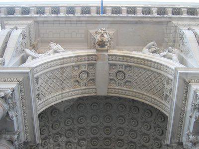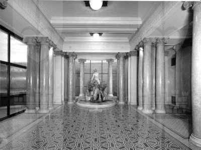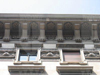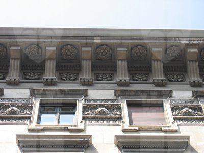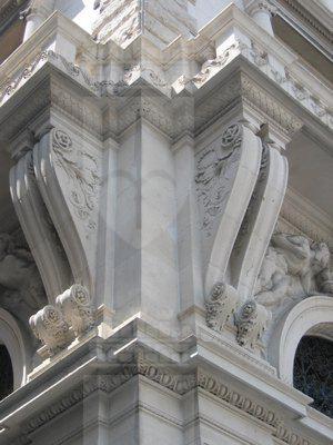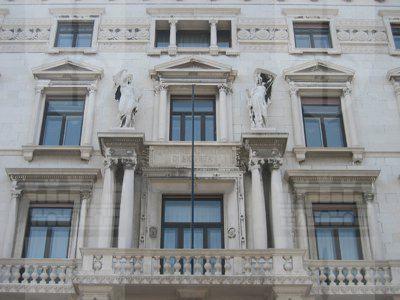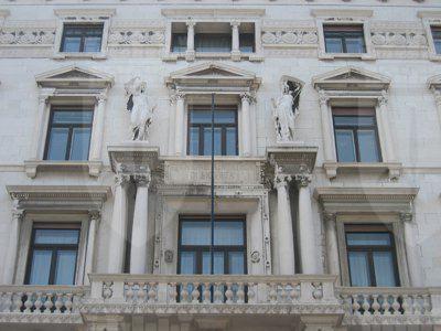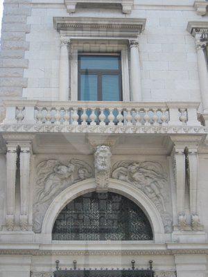 ELEMENTI ORNAMENTALI (esterno): Elementi decorativi a motivi floreali in pietra a rilievo in corrispondenza delle specchiature tra i fori architettonici all'ultimo piano e dello sporto di linda. ELEMENTI ORNAMENTALI (esterno): Chiave di volta a decorazione degli archi a tutto sesto, raffigurante volto di uomo scolpito in pietra. MENSOLE (esterno): Mensole a voluta in pietra a sostegno dei balconi e dello sporto di linda. BALAUSTRE (esterno): Parapetto dei balconi in pietra con balaustrini ad anfora. STATUE (esterno): Statue poste in corrispondenza dell'ammezzato nelle lunette della facciata principale raffiguranti le personificazioni di Fuoco e Aria, Pensiero e Azione, Acqua e Terra, eseguite dallo scultore Giovanni Mayer. STATUE (esterno): Statue poste in corrispondenza del secondo piano della facciata principale raffiguranti le personificazioni della Previdenza e della Protezione, eseguite dallo scultore Gianni Marin.