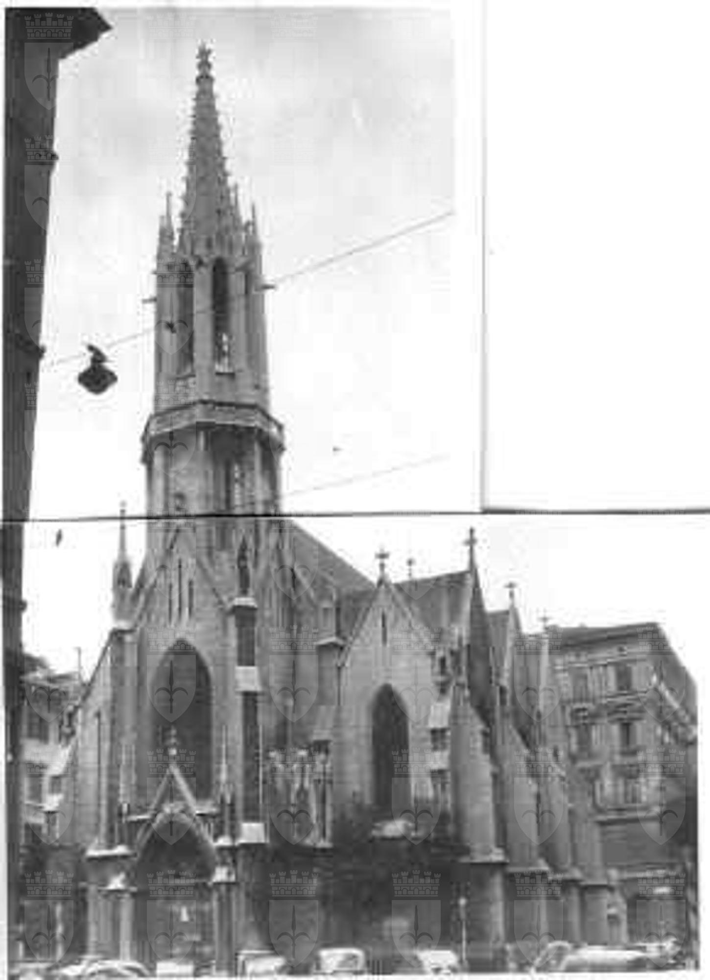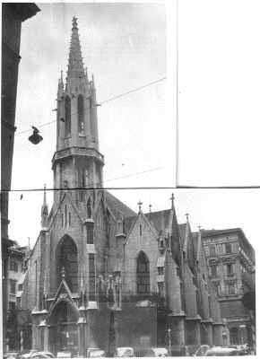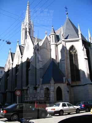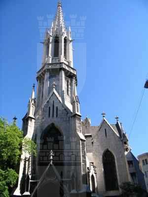 La chiesa, al centro di una piazza chiusa da alti palazzi, si presenta nelle forme agili e frastagliate del gotico tedesco. Esternamente è caratterizzata da contrafforti scalari, archi acuti, guglie e pinnacoli. L'abside è poligonale. Al centro della facciata principale, sopra al portale gotico, s'innalza un alta torre campanaria. L'interno, diviso in tre navate da quattro colonne, riceve luce dalle alte finestre ogivali con intrecci a traforo che si aprono sulle tre campate delle navate, sulla facciata e sull'abside.