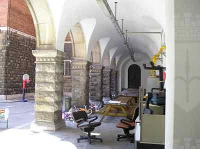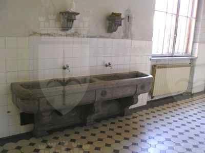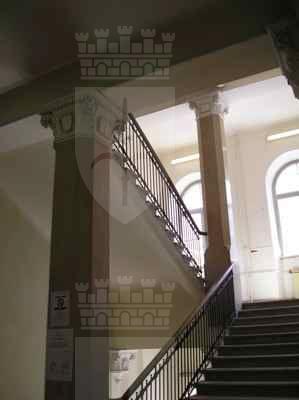 LESENE (Esterno): Lesene realizzate in mattoni di laterizio e blocchi squadrati lisci di pietra bianca; la parte sommatale, è integrata da due doppie mensole in pietra bianca, decorate a foglia d'acanto, poste sotto la cornice del tetto. MENSOLE (Esterno): Mensole in pietra bianca decorata a foglia d'acanto e volute. STEMMA (Esterno): Stemmi rettangolari in pietra bianca, raffiguranti un'alabarda, inseriti nel bugnato della facciata di Via Commerciale e di Via Manna. MARCAPIANO (Esterno): Cornice marcapiano, posta tra il terzo e quarto piano, in pietra bianca con gocciolatoio a dentelli, modanata da fasce lisce e listelli. CORNICE (Esterno): Cornice neoclassica composta da lastre in pietra bianca e decorata con modanature a fascia e ad ovuli. FONTANA (Interno- cortile): Fontana in pietra bianca collocata in cortile e interclusa nel bugnato del piano terra: la struttura è composta da un arco a tutto sesto, in conci squadrati e bugnati con concio di chiave raffigurante un panduro, rivestito sull'estradosso da una cornice in pietra bianca modanata e, sullo sfondo, da una specchiatura semicircolare. Il fronte della vasca è di forma semicircolare convessa, sporgente dal filo del muro, e decorato da pannelli in pietra. STEMMI (Interno- cortile): Cinque stemmi in pietra bianca, inseriti nella superficie bugnata del prospetto della palestra, collocati tra le doppie finestre e costituiti da pannelli lapidei raffiguranti simboli ludici. STEMMI (Interno- cortile): Quattro stemmi in pietra posti sotto la prima cornice marcapiano del portico e in asse con l'imposta degli archi: sono costituiti da un unico pannello con cornice nel quale sono raffiguranti strumenti utilizzati per lo studio della musica, della geografia, del disegno e degli scritti. FONTANE (Interno): Fontane in marmo di Aurisina, disposte lungo la parete del corridoio e costituite da una pannello in pietra, fissato al muro, e da una vasca monolitica sorretta da piedritti modanati di stessa natura. MENSOLE (Interno): Mensole in pietra modanate con volute e foglie d'acanto, inserite nel muro del corridoio del primo piano ed utilizzate ad uso ornamentale. BUSTO (Interno): Busto in bronzo raffigurante Guido Corsi, collocato nell'atrio dell'ingresso principale, con lapide commemorativa in marmo. STATUA (Interno): Statua in pietra bianca con basamento in marmo, sistemata nella navata laterale dell'atrio d'ingresso e raffigurante una figura in stile classico.