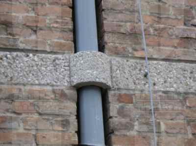 CORNICE: cornice del tetto composta da una serie di grossi dentelli a forma di cuneo in pietra massiccia, cinti superiormente da una sopracornice in lastre di pietra lisca. MARCAPIANO: in pietra artificiale posta a filo della muratura con blocchi sagomati per l'inserimento del pluviale.