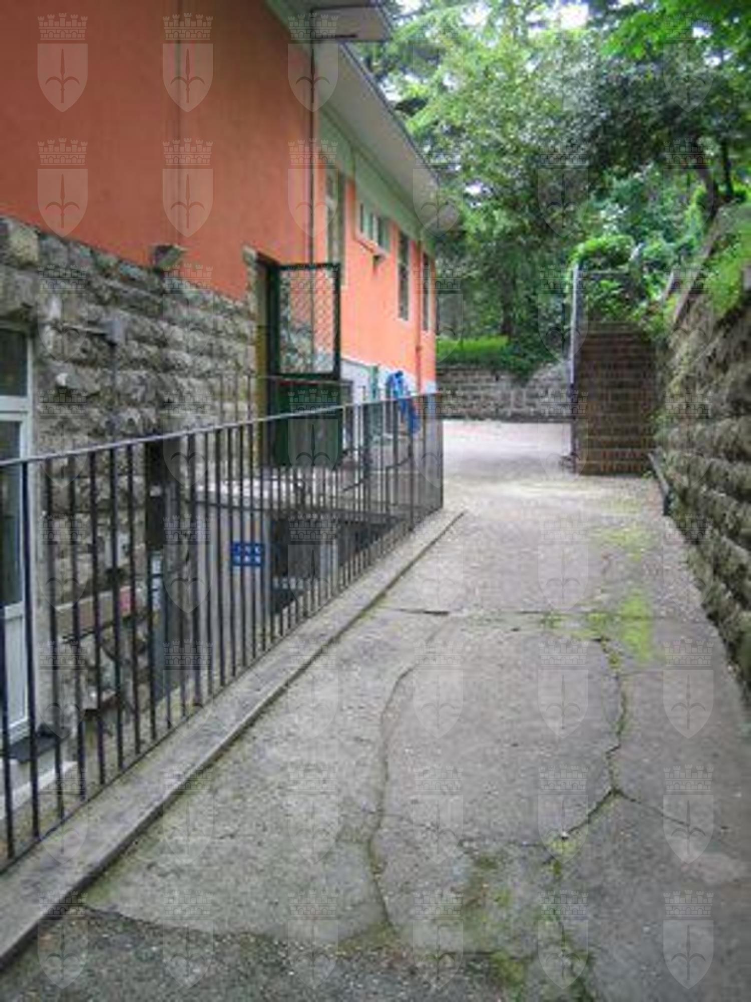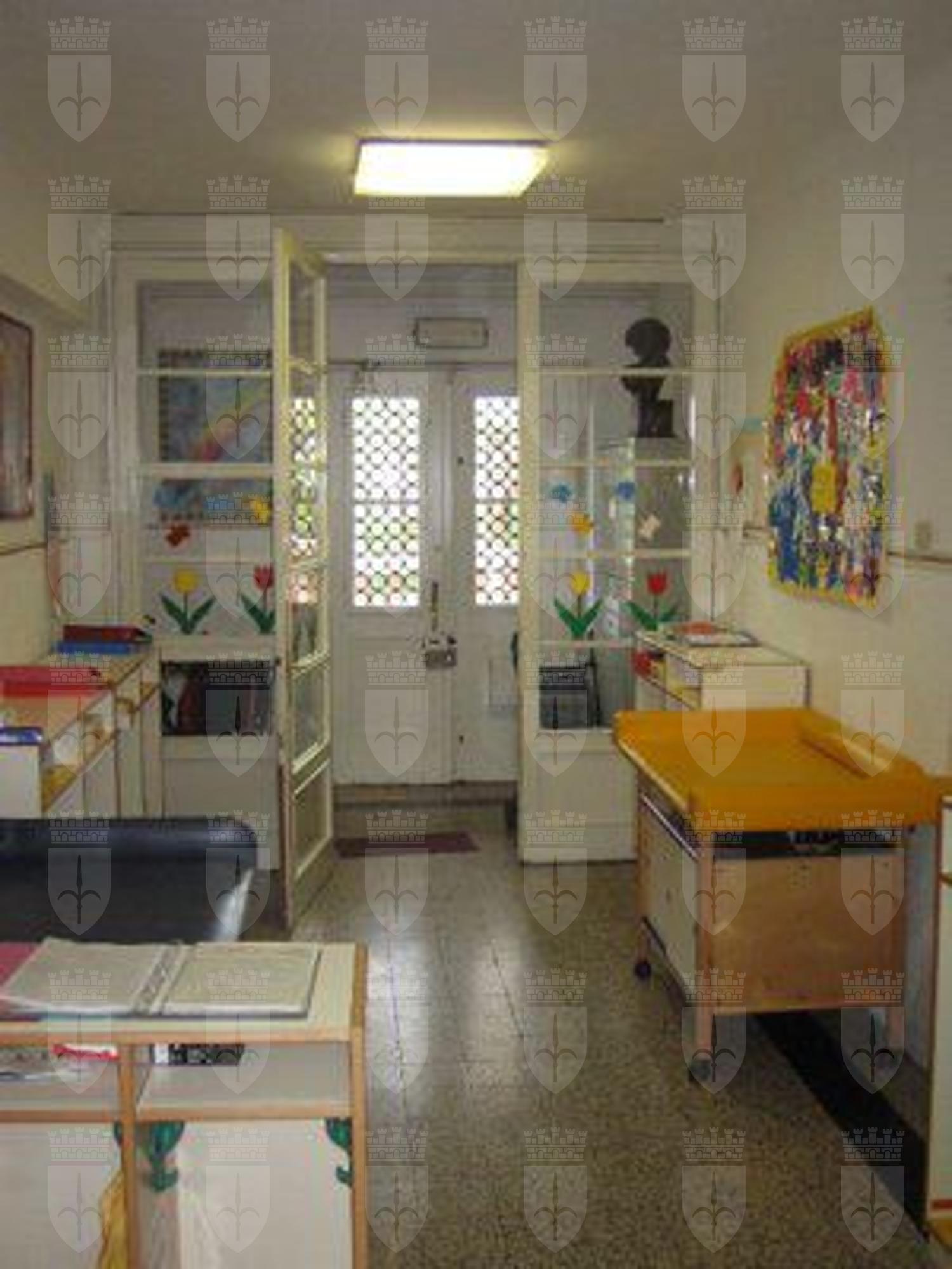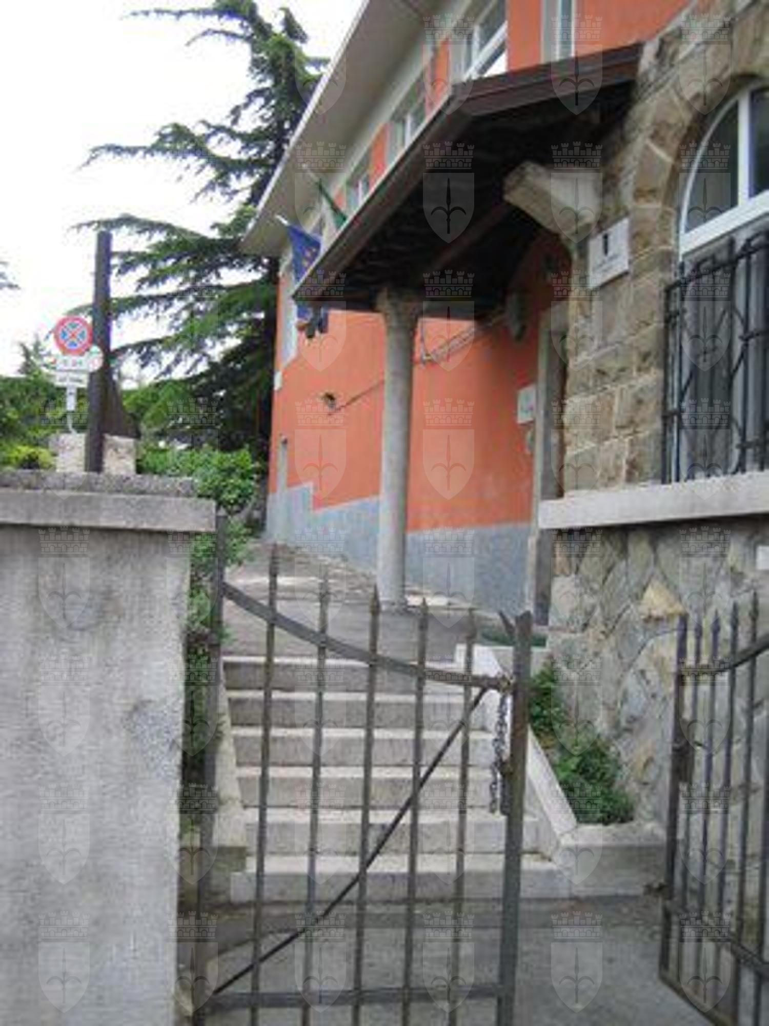 Il corpo di fabbrica di destra ha una fascia basamentale in conci di pietra arenaria. La facciata è intonacata e tinteggiata color rosa salmone. Una cornice in pietra bianca è posta all'altezza delle architravi dei fori architettonici del secondo livello. La porzione di facciata sotto la linda è intonacata e tinteggiata color grigio. Il corpo di fabbrica di sinistra ha un basamento in intonaco trattato a rustico; la facciata è interamente intonacata e tinteggiata color rosa salmone e grigio nella porzione sotto la linda. Il foro d'ingresso principale è incorniciato da elementi in pietra bianca; il portone è a due battenti in legno con doppia specchiatura; è sormontato da una tettoia in travi di legno con manto di copertura in coppi rossi sostenuta da un reggimensola e da una colonna in pietra bianca. I fori del primo livello che danno sul fronte strada e sul parcheggio interno sono a tutto sesto ad eccezione della porta di servizio sul fabbricato di sinistra. I fori sul retro sono di forma rettangolare. Fori rettangolari al secondo livello; solo le finestre del volume di destra hanno il gocciolatoio in pietra bianca. Tutti i serramenti sono in PVC color bianco; sul fronte principale a quattro o sei svecchiature; sul retro a due o tre specchiature protette da grate in ferro. Fa eccezione l'uscita di sicurezza posta sul retro che è in alluminio verniciato nero. Il fabbricato di destra ha, al secondo livello, un ampio terrazzo piastrellato cinto da un parapetto in pietra bianca con tamponature in elementi di laterizio. Gronda e pluviali in lamiera verniciata color marrone e rosa salmone. Su fronte strada il fabbricato è cinto da un muro in pietra arenaria parzialmente intonacato e da un parapetto con elementi in pietra bianca. L'accesso al portone principale dell'edificio avviene tramite una rampa di gradini in pietra bianca. Sul lato destro un cancello in ferro chiude il parcheggio asfaltato e il piccolo parco giochi pavimentato con ghiaia. All'interno tutti gli ambienti del primo livello sono pavimentati con piastrelle di ceramica; al secondo livello corridoi e servizi pavimentati con piastrelle, aule con listelli di legno o linoleum. Alcune stanze sono controsoffittate in pannelli di fibre minerali. La scala ha gradini in pietra bianca bulinata, parapetto in ferro battuto e corrimano in legno. Serramenti interni e partizioni in legno verniciato color bianco.