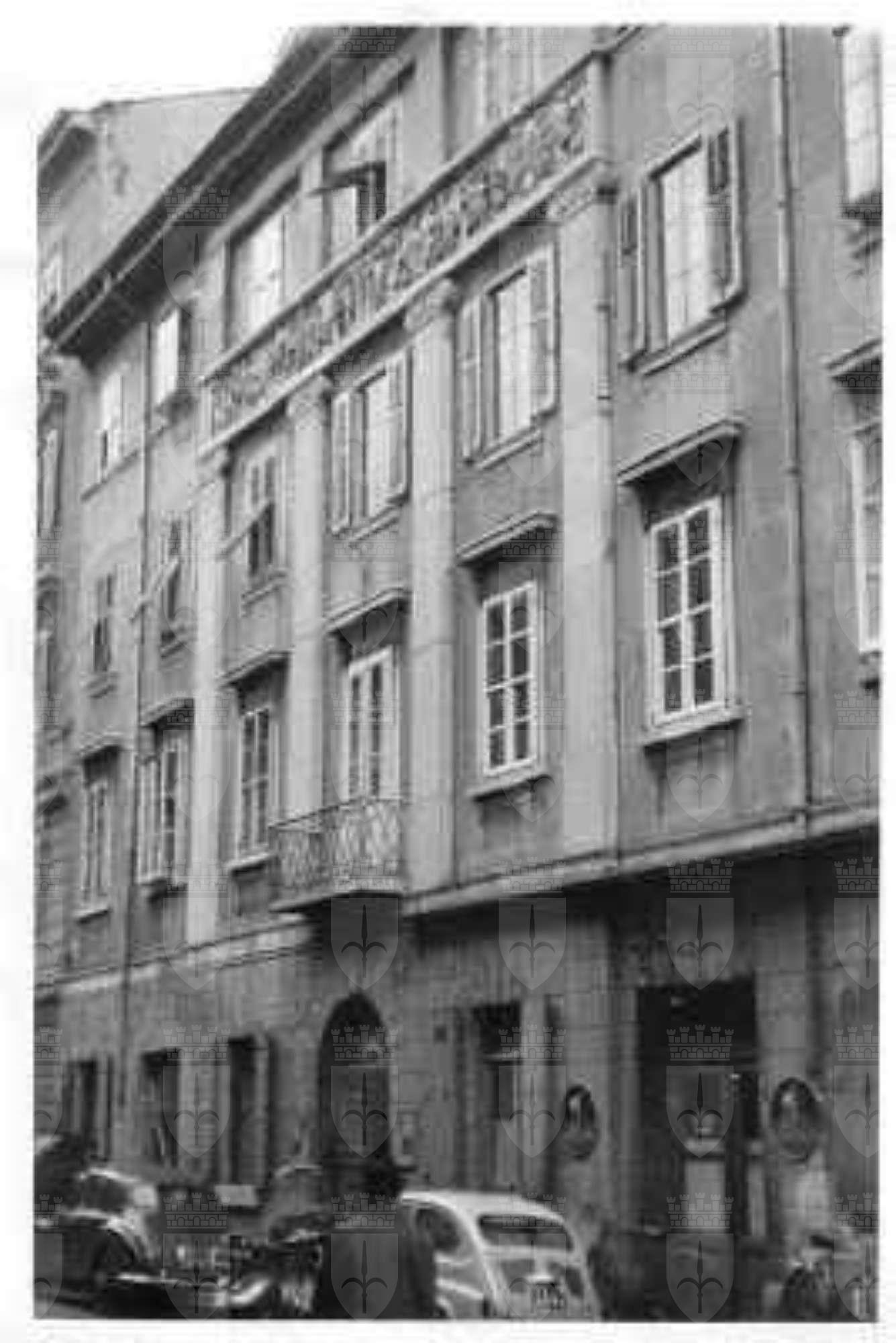 L'edificio, a pianta quasi quadrata, è costituito da quattro piani fuori terra. Il pianoterra è trattato a bugnato liscio a corsi orizzontali e le aperture sono riquadrate da conci in pietra bianca. Una serie di cartelle rettangolari precedono le aperture del primo piano. Le finestre laterali del primo piano presentano, sotto la cimasa rettilinea aggettante, una decorazione a drappeggio con roselline. La parte centrale della facciata, lievemente emergente, è caratterizzata da quattro lesene ioniche di ordine gigante e da un balcone con balaustra in ferro battuto, posto in corrispondenza del portale d'ingresso ad arco. Le lesene, che s'impostano sul marcapiano, sostengono un lungo fregio a bassorilievo raffigurante un sacrificio in onore di divinità, molto probabilmente scolpito da Antonio Bosa. All'ultimo piano, sopra il riquadro a rilievo, bassi piastrini si alternano alle finestre semplicemente riquadrate. Una cornice a dentelli fa da cerniera tra la parte finale della facciata e il tetto.
