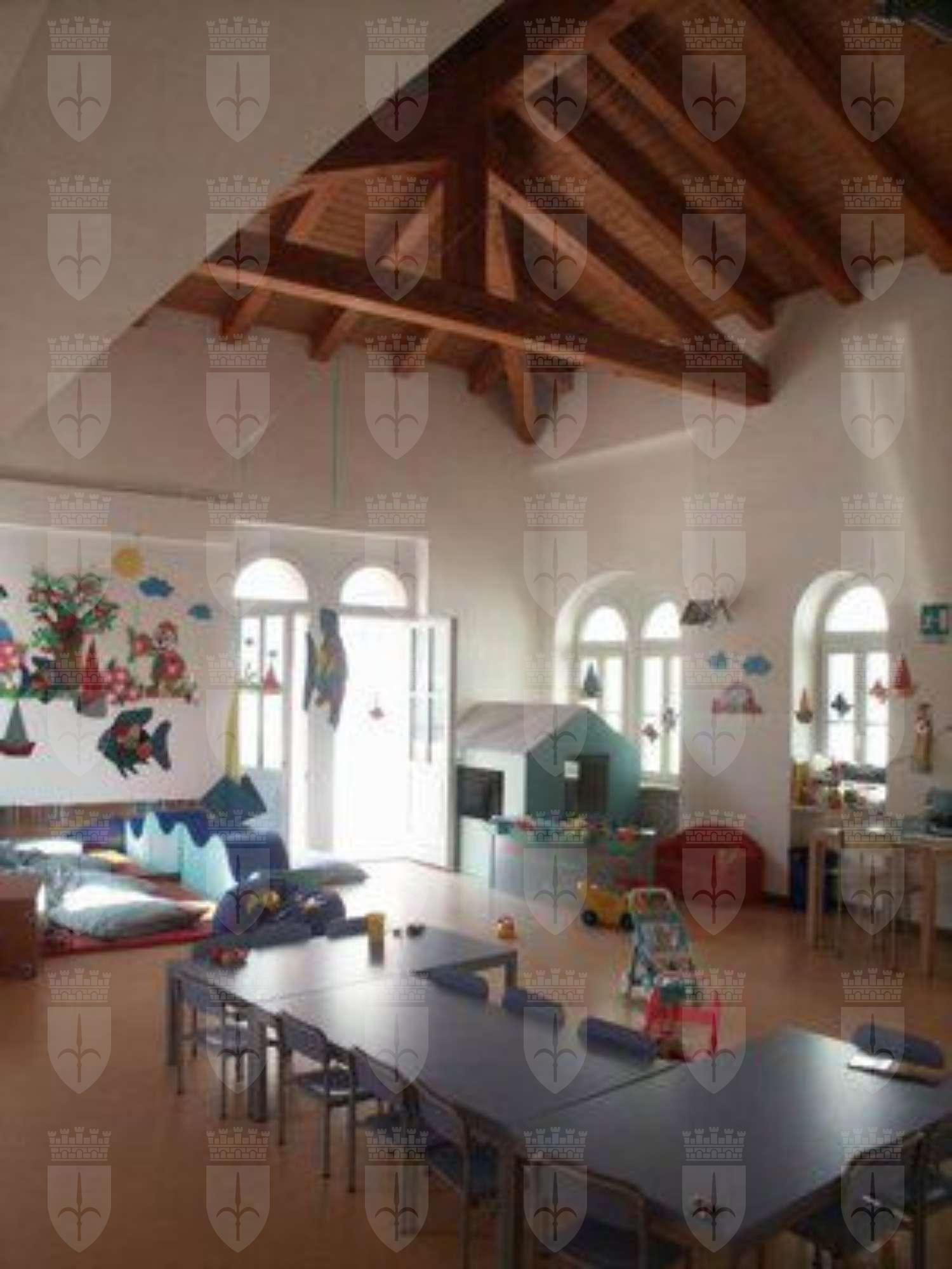 Immobile su due livelli continui fuori terra. La recente realizzazione del nuovo ingresso sulla Via Alessandro Manzoni, con struttura metallica in acciaio verniciato color antracite, travature in legno lamellare ed ampie specchiature vetrate, costituisce l'atrio di accesso all'asilo comunale ed il collegamento con l'attiguo edificio. La pianta dell'edificio è suddivisa in un corpo centrale a due livelli con copertura falde e due corpi laterali ad un solo livello con copertura piana calpestabile. Sul retro del corpo principale sono stati recentemente edificati nuovi corpi edilizi ad un livello. Il prospetto principale è simmetrico e presenta elementi decorativi in stile neorinascimentale; il corpo centrale, in leggero aggetto, presenta due portali laterali. La facciata è suddivisa orizzontalmente da una cornice marcapiano posta in continuità con la copertina superiore del parapetto delle terrazze delle ali laterali. Le strutture verticali sono in muratura portante di arenaria a corsi irregolari suborizzontali, con cordoli perimetrali in calcestruzzo armato. Strutture orizzontali in laterocemento e copertura a falde con struttura in legno lamellare composta da capriate a sostegno della trave di colmo, puntoni ortogonali alla trave di colmo e tavolato ligneo. I vani scala sono appoggiati sulla muratura portante.