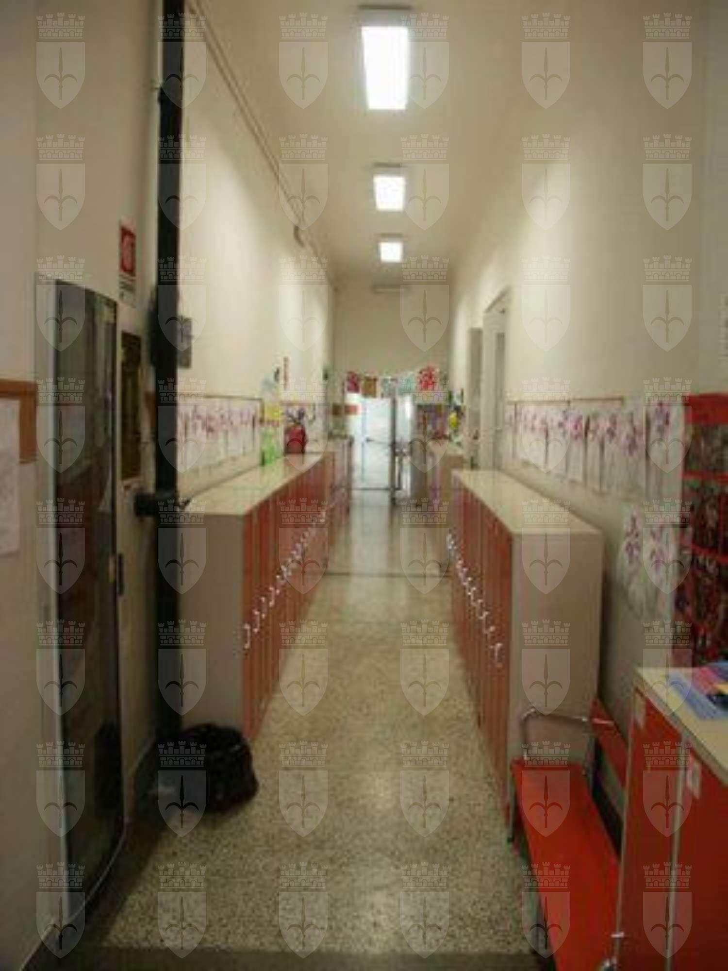 Serramenti esterni in alluminio verniciato bianco a due ante con sopraluce vetrato. Abbassamento in pietra bianca bocciardata a correre lungo tutto il perimetro dell'edificio; superficie di facciata trattata a finto bugnato ad intonaco in corrispondenza del piano terra; marcapiano modanato in pietra bianca a correre lungo l'intero perimetro dell'edificio. Sul prospetto rivolto verso il cortile interno, due fori architettonici risultano tamponati in muratura rifinita ad intonaco. Scala esterna di accesso al cortile in pietra bianca bocciardata. Banchina trattata ad intonaco, gronda e pluviale in lamiera. Copertura a padiglione con manto in coppi curvi rossi uso Trieste. Serramenti interni originali in legno massello verniciato colore grigio in corrispondenze delle aule; pavimento in linoleum nell'atrio di ingresso, in battuto di cemento e graniglia nei corridoi al piano terra, in parquet ligneo nelle aule; scala in pietra bianca bocciardata, rivestita in lineoleum, balaustra in ferro verniciato decorata da motivi geometrici e corrimano ligneo; corridoio al primo piano pavimentato in linoleum. Superfici murarie intonacate colore bianco e controsoffitto a sospensione con correnti in alluminio e pannelli alleggeriti.