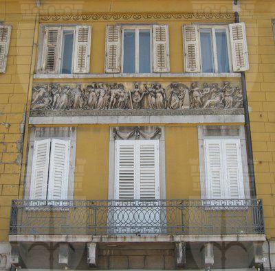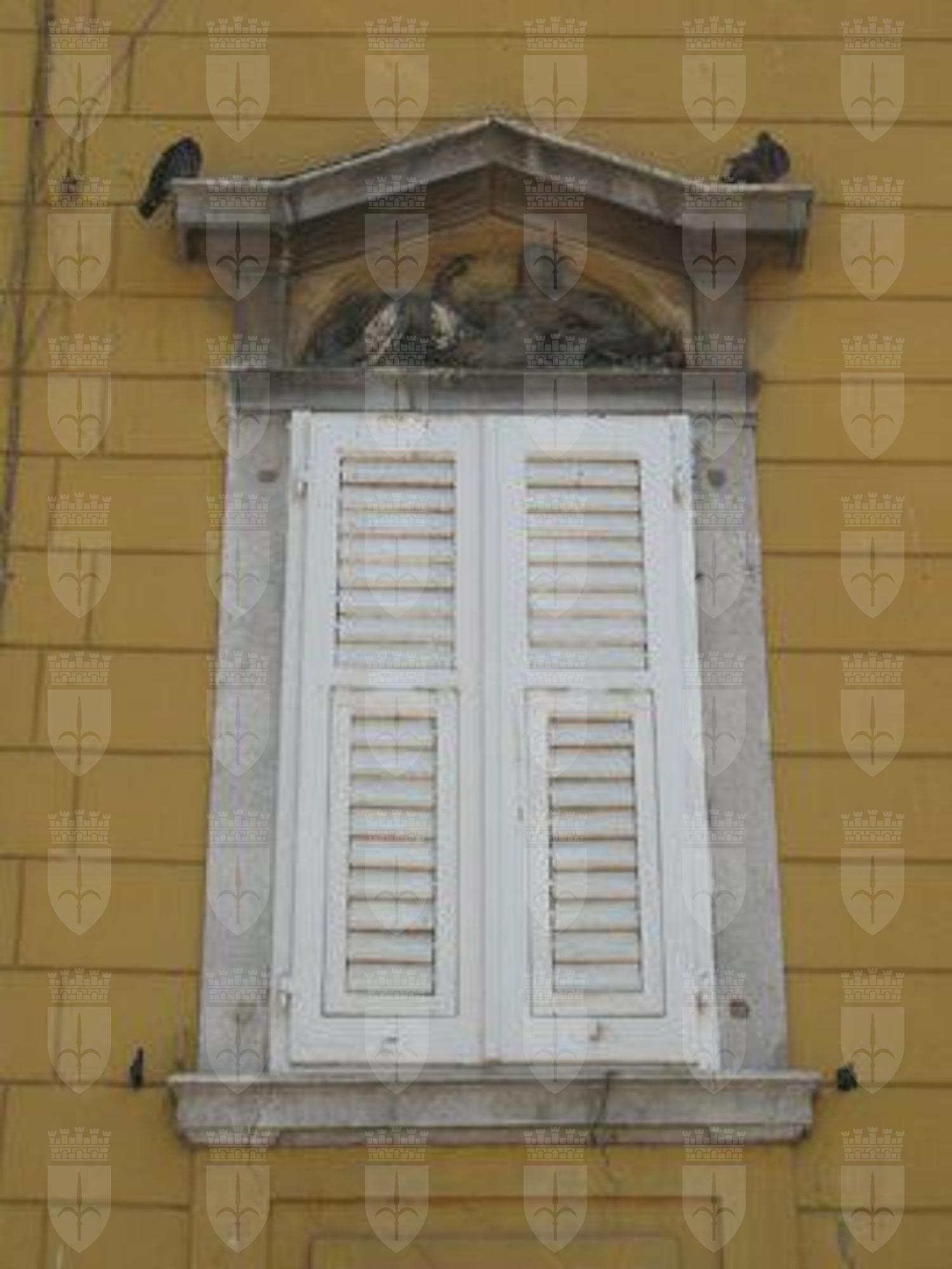 LUNETTE (esterno): Decorazioni a bassorilievo raffiguranti figure allegoriche in corrispondenza delle lunette del piano nobile. FREGIO (.esterno): Pannello a bassorilievo raffigurante una scena classica, attribuito allo scultore Antonio Bosa, inserito al di sopra delle finestre centrali del piano nobile.