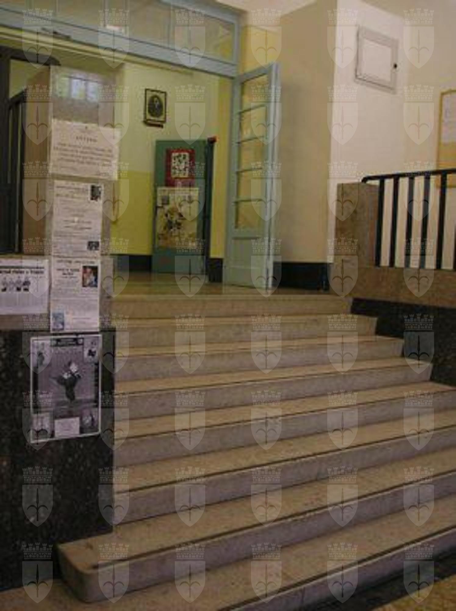 STELE (esterno): pilastro in pietra massiccia, inserito nel parapetto della scala e decorato con un'alabarda scolpita; sul retro è previsto l'alloggiamento dell'asta di una bandiera con due staffe in metallo (P1010030.JPG). OROLOGIO (esterno): orologio posizionato sul timpano in muratura del prospetto principale. MARCAPIANO (esterno): marcapiano in pietra artificiale, a profilo rettangolare, disposto sul limite superiore del rivestimento del piano interrato. CORNICE (esterno): cornice del tetto, a profilo rettangolare con gocciolatoio, in pietra artificiale.