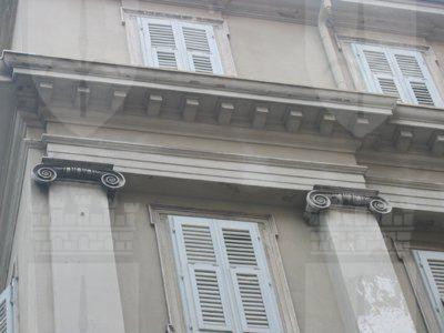 COLONNE E PILASTRI (esterno): Struttura costituita da sei semicolonne ioniche e tre semipilastri di ordine gigante su alto basamento in corrispondenza del primo e del secondo piano del prospetto principale. BALCONE (esterno): Balcone con balaustra in pietra in corrispondenza dell'angolo sinistro al primo piano del prospetto principale. CORNICE (esterno): Cornice a dentelli a decorazione della trabeazione del prospetto principale.
