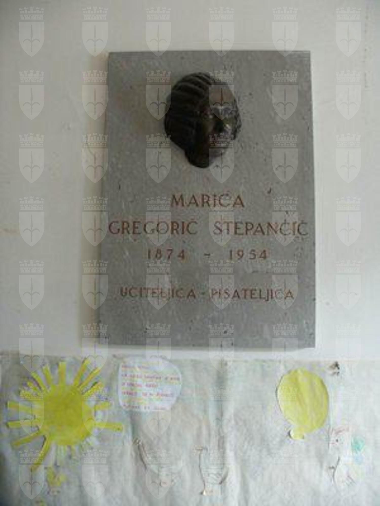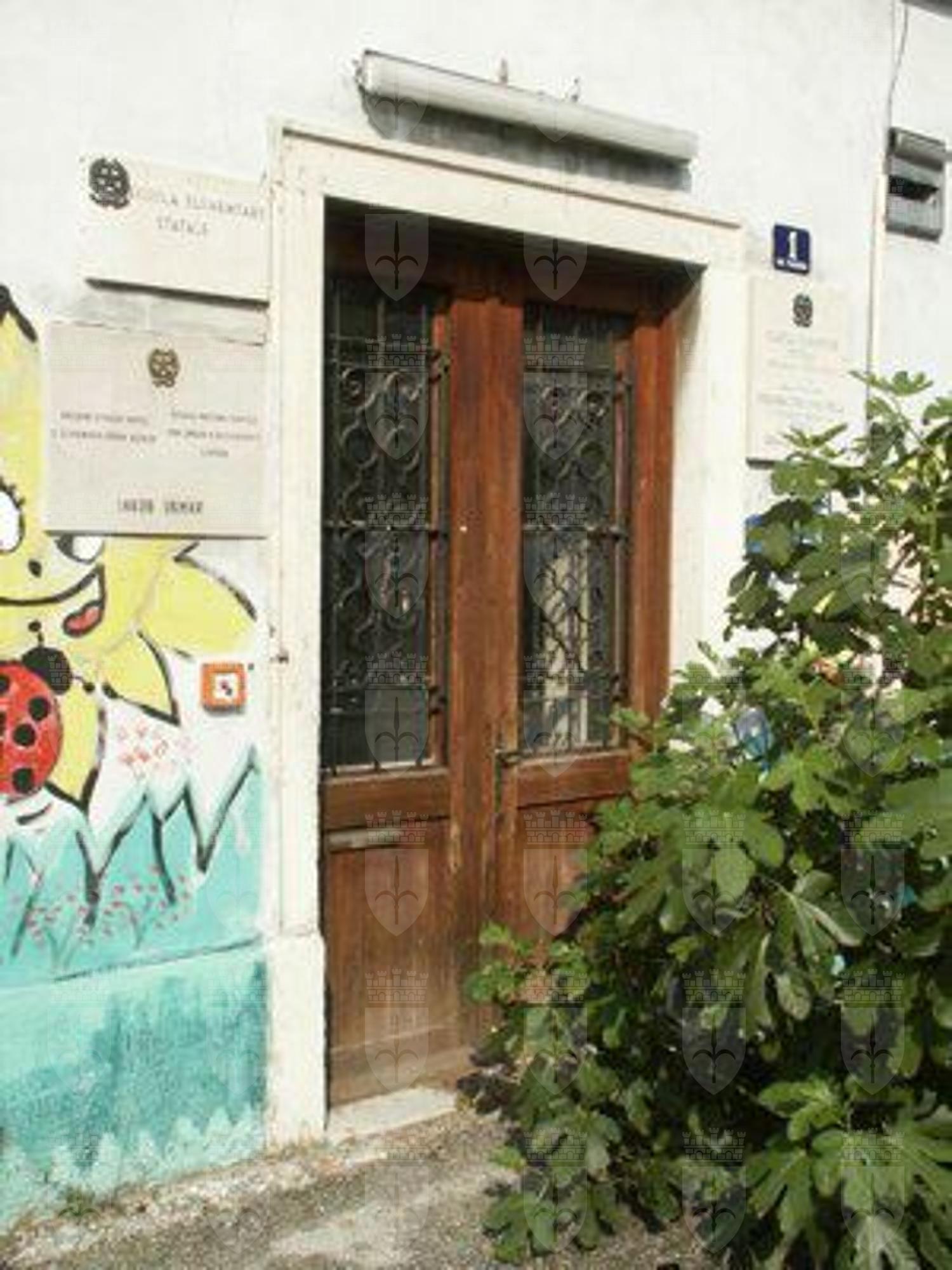 GRAFITI (esterno) Graffiti murali in corrispondenza della fascia basamentale della facciata principale, presumibilmente eseguiti dagli alunni che un tempo frequentavano la scuola; vi sono raffigurati bambini, alberi, animali, funghi ed altri elementi naturali. LAPIDE(interno) Lapide in pietra di Aurisina, riportante la dicitura "MARICA GREGORIC STEPANCIC, 1874-1954, UCITELJICA-PISATELJICA" e riportante la relativa raffigurazione del volto.