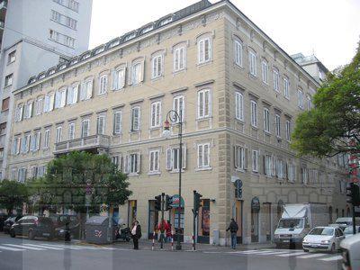 L'immobile sorge su Via Cesare Battisti, già Corsia Stadion, il cui nome deriva dal conte Stadion che nel 1846 diventa promotore dell'imbonimento del "torrente detto dello Scoglio, proveniente dal monte Staribrek a S. Giovanni, il quale andava a congiungersi all'altro detto di Cluz al ponte di Chiozza" (Generini, 1968, p. 322). Come testimoniano le fonti dell'epoca, dalla metà dell'Ottocento la via, in origine fiancheggiata da case di modeste dimensioni e di "poca apparenza", si caratterizza per la presenza di importanti palazzi, diventando "in breve una delle più belle vie della città" (Generini, 1968, p. 322-323). L'edificio in esame s'inserisce nella fase più importante di sviluppo urbanistico della zona, databile alla metà dell'Ottocento. L'edificio viene costruito nel 1828 su progetto di Giovanni Degasperi; nel 1852 l'architetto Luigi Buzzi interviene pesantemente sull'edificio con la sopraelevazione di un piano, determinando l'aspetto architettonico attuale. Nel corso del Novecento il palazzo, in particolare per quanto riguarda la parte del pianterreno destinata ad ospitare attività commerciali, è interessato da interventi di ristrutturazione e modifiche interne. Il vincolo è limitato alla facciata.