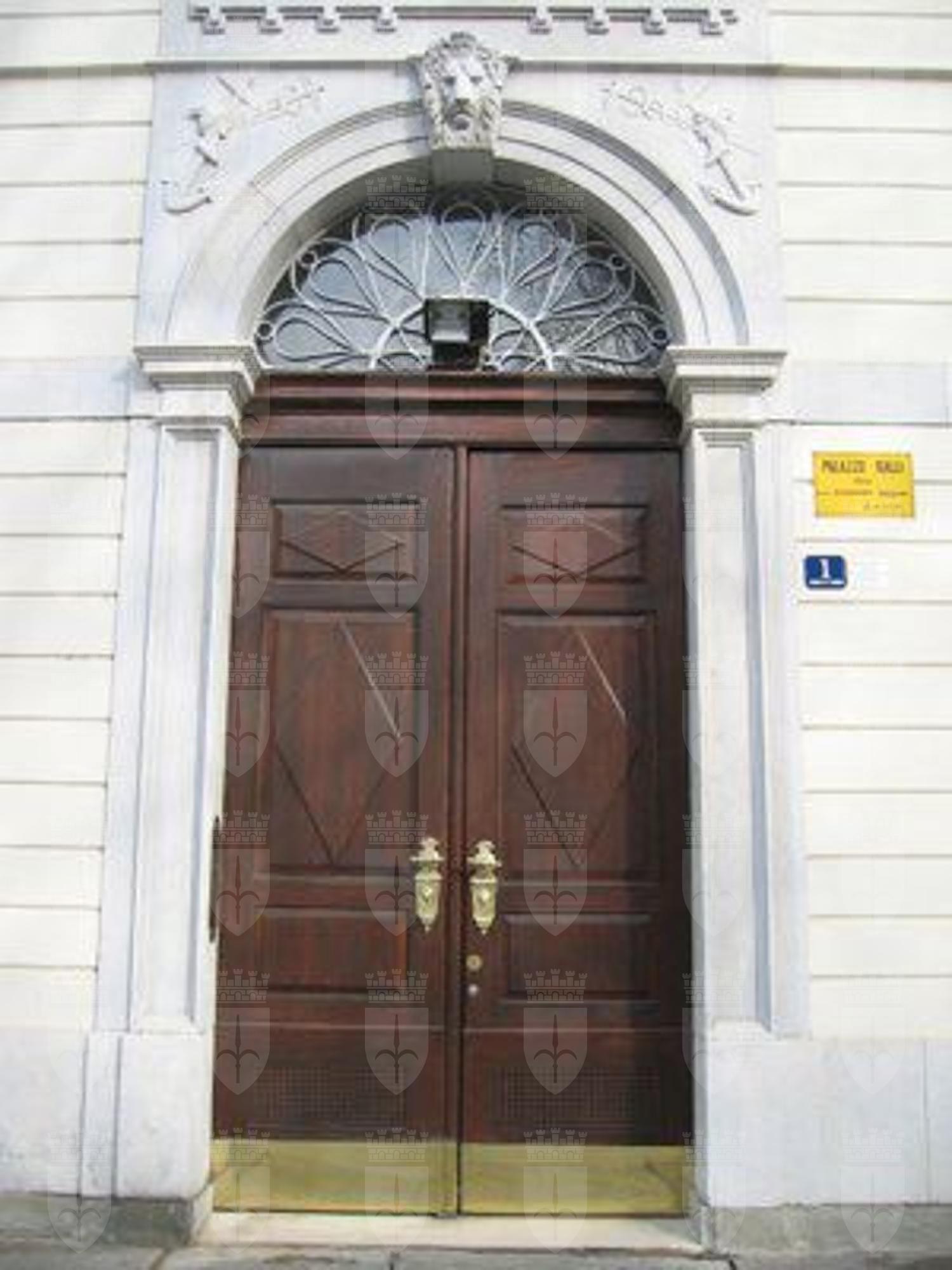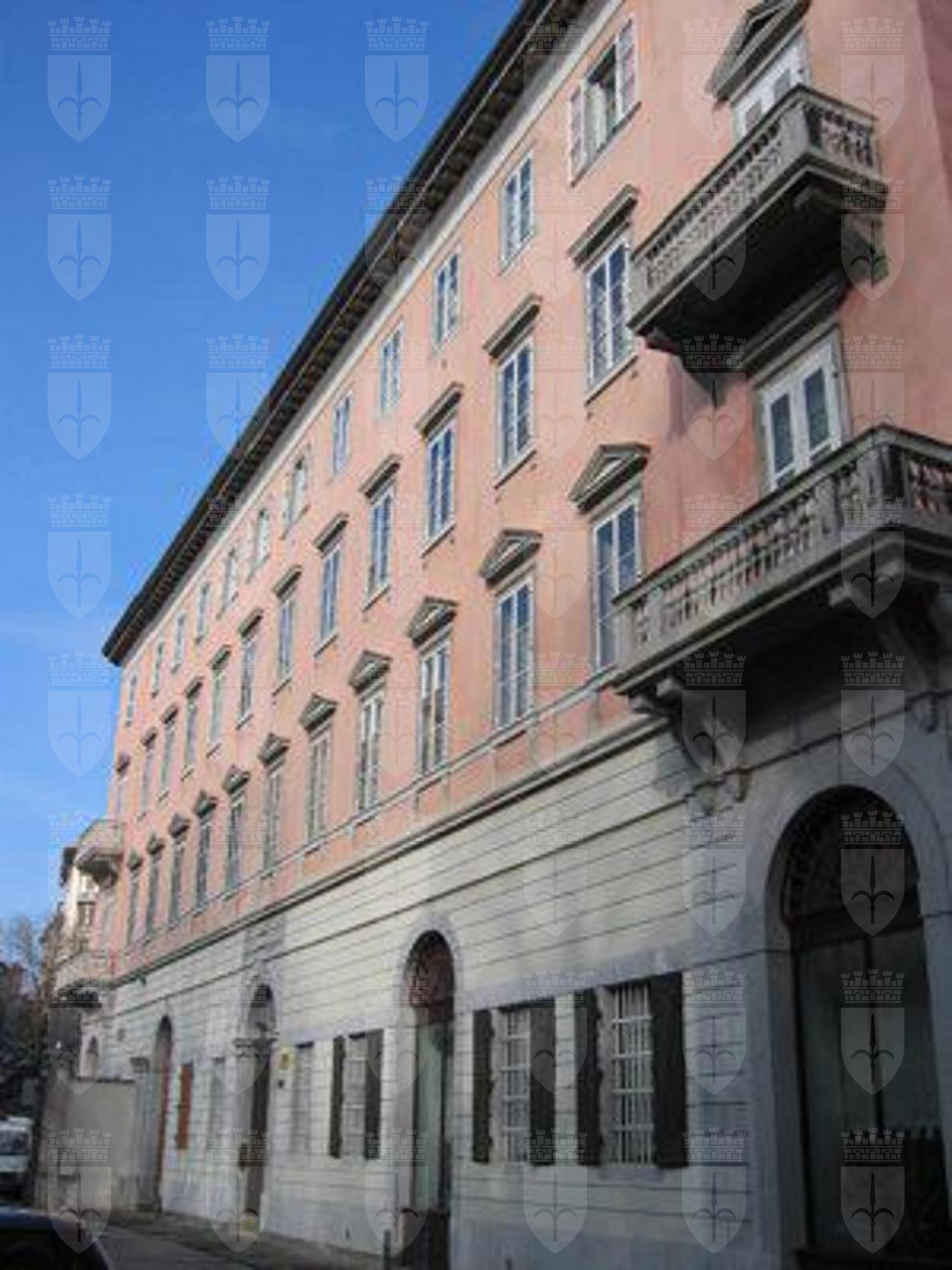 PORTALE (esterno): Portale d'ingresso ad arco a tutto sesto inquadrato da una struttura a semipilastri in pietra bianca con rilievi rappresentanti simboli relativi all'attività commerciali in corrispondenza delle specchiature laterali dell'arco nel prospetto principale. BALCONI (esterno): Balconi con balaustra a colonnine in pietra in corrispondenza delle estremità del secondo e trao piano del prospetto principale e del lato breve. CORNICE (esterno): Cornice a dentelli in pietra a coronamento dell'edificio.