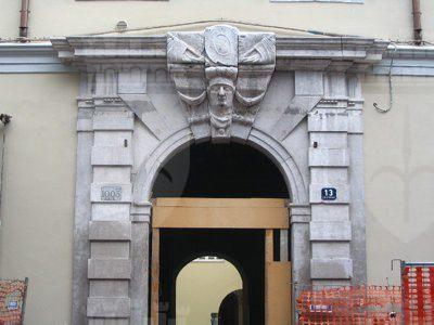 MASCHERONE (esterno) Panduro in pietra raffigurante una testa d'uomo in chiave di volta del portale. Il panduro è sormontato da uno stemma ovale e trofei militari. LAPIDE (esterno) Lapide recante l'iscrizione "Il 17 marzo 1803 nacque in questa casa Luigi de Jenner emerito ricercatore e conservatore di patrie memorie lasciò contributi preziosi alla storiografia locale". La lapide fu apposta dal Comune di Trieste il 28 marzo 1950.