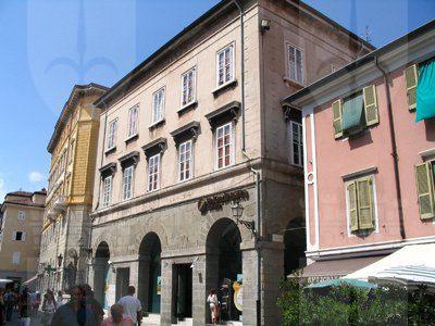 Il fabbricato venne edificato nel 1827 su progetto di Pietro Nobile. Il progetto per casa Fontana risulta dalla rielaborazione di un disegno predisposto da Nobile nel 1813 per la costruzione di un mercato del pesce in un'altra zona della città, l'attuale piazza Hortis. L'area sulla quale venne costruito l'immobile in precedenza era occupata dal magazzino del sale, fatto erigere dall'imperatore Carlo VI agli inizi del Settecento e demolito nel 1821. L'edificio, in stile neoclassico, venne fatto costruire dal Comune che lo destinò a mercato del pesce. Al pianterreno, infatti, c'era un portico sorretto da colonne doriche, dove si svolgeva il commercio. I due piani superiori erano ad uso di abitazione privata. Nel 1829 il commerciante di tabacco Pietro d'Ottavio Fontana entrò in possesso del primo e del secondo piano dell'edificio; mentre nel 1831, rivelatosi insufficiente lo spazio per il mercato del pesce che venne trasferito altrove, il Comune cedette al Fontana anche il porticato. Nel 1831, su disegno di Valentino Valle, Fontana fece chiudere il porticato per ricavare dei locali da adibire a magazzino. La facciata principale, in origine, era decorata con clipei a bassorilievo e finestre sormontate da timpani rettilinei. All'interno alcuni soffitti presentano delle decorazioni ad affresco. Al secondo piano, sulla parete della scala elicoidale vi è un affresco che riproduce l'aquila e la lapide che si trovava nel demolito magazzino del sale. Si tratta di una commemorazione della battaglia di Zenta. Nel 1884 al primo piano di casa Fontana aveva sede il "Gabinetto di Minerva". Nel 1955 l'immobile era di proprietà del barone Giuseppe Morpurgo e della baronessa Lavinia Morpurgo nata Fontana. Nel 1988 l'edificio è stato interessato da lavori di ristrutturazione. In particolare al piano terra sono state realizzate opere funzionali per l'adattamento degli spazi ad ufficio bancario.