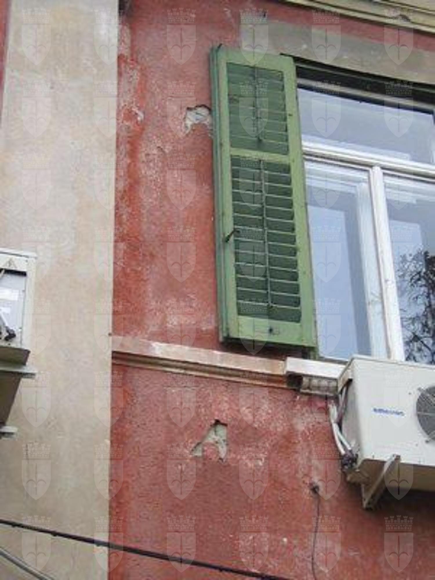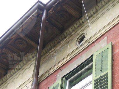 CANCELLO IN FERRO BATTUTO (esterno): Cancello d'ingresso in ferro battuto verniciato color grigio con decorazioni a volute e montante superiore recante l'effige dell'alabarda. (IMG_1325) TETTOIA IN FERRO BATTUTO (esterno): Tettoia a copertura del portone d'ingresso principale in ferro battuto retta da due staffe a voluta recanti motivi floreali. (IMG_1352) LAPIDE (esterno): Lapide in marmo recante la probabile data di edificazione: A.D. MCMI. (IMG_1352) CORNICE DECORATIVA (esterno): Cornice decorativa del foro del vano scala in pietra bianca, elegantemente lavorata con volute. (IMG_1352) PARAPETTO IN FERRO BATTUTO (esterno): Parapetto dei poggioli in ferro battuto recante scudi tondeggianti e motivi vegetali. (IMG_1375) DECORAZIONE LIGNEA A CASSETTONI (esterno): Decorazione lignea a cassettoni nell'intradosso della linda; nei quadroni sono inserite figure circolari concentriche. (IMG_1373) PARAPETTO SCALA CENTRALE (interno): Parapetto della scala centrale in ferro battuto con decorazioni a volute. (IMG_1340)