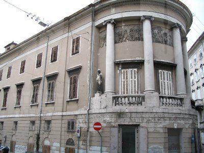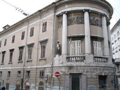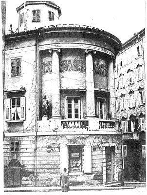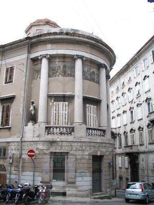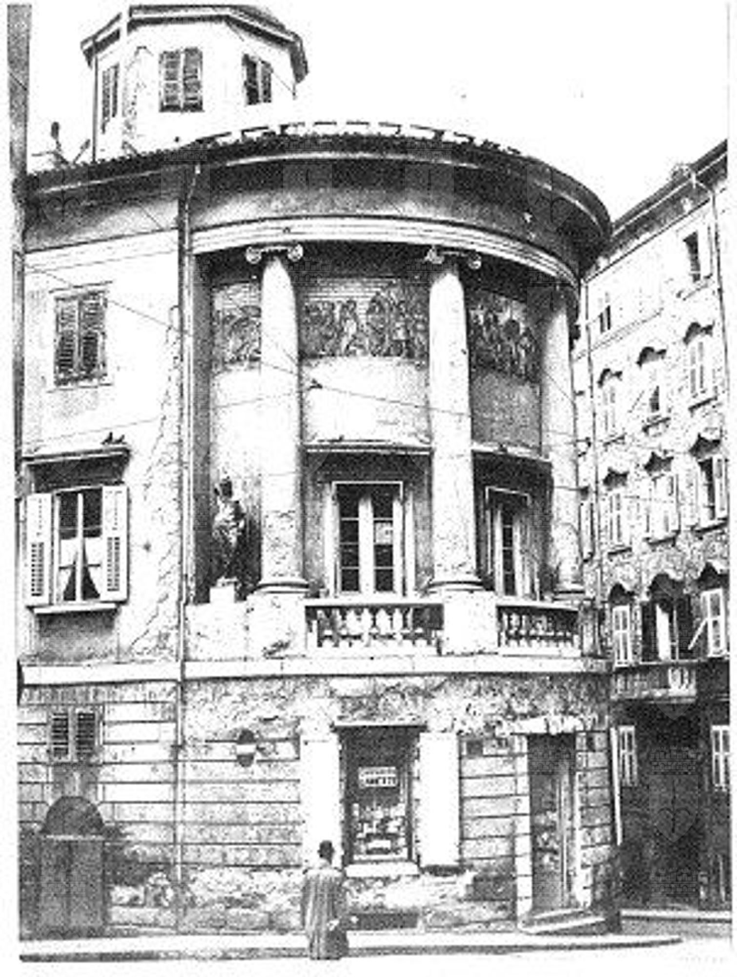Pertsch si trovò ad operare in un lotto di terreno a cuneo altimetricamente malagevole nel tessuto urbano frammentario e irregolare della città medievale. Per prima cosa egli realizzò un piano orizzontale, costituito dal piano terra a bugnato, sul quale appoggiare la costruzione. Sull'angolo acuto del lotto, Pertsch progettò una facciata semicircolare con colonne ioniche di ordine gigante. Le colonne sono addossate al muro nel quale si aprono tre porte finestre con balaustra tra i basamenti delle colonne stesse e, nella parte superiore, dei bassorilievi. Nello spazio tra le colonne esterne e la muratura delle facciate laterali, sono collocate due statue raffiguranti Marte e Minerva. Il colonnato sostiene una cornice spessa fortemente aggettante che presenta decorazione a ovuli e una fascia a dentelli. All'interno dell'edificio, in corrispondenza della facciata convessa, si trova una sala circolare voltata a cupola con affreschi attribuiti a Giuseppe Gatteri, così come gli affreschi di ispirazione pompeiana che si trovano in una saletta attigua.