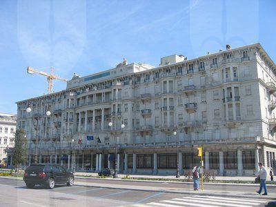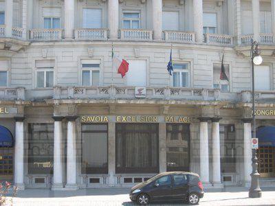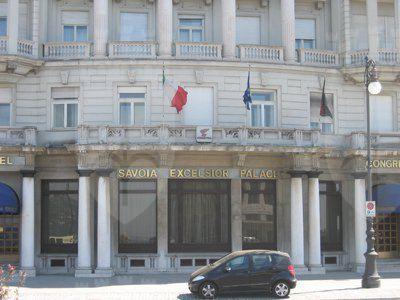 L'immobile sorge sul sito occupato fino agli inizi del Novecento dagli edifici della Sanità e del Governo Marittimo, trasferiti rispettivamente presso la Lanterna e nell'area di Sant'Andrea. Risale al 1841 il primitivo progetto di costruzione del teatro Ferdinandeo, poi non concretizzato, sull'area di Riva Mandracchio, creata dalle opere settecentesche di imbonimento del tratto di mare antistante. L'edificio in esame viene costruito tra il 1910 ed il 1912 su progetto, datato 6 luglio 1910, dell'architetto viennese Leopoldo Fiedler. La realizzazione del palazzo viene affidata alla Società di Costruzioni Union, seguita da Giuseppe Hinnel. Le fondamenta vengono gettate dall'impresa Ways Wastermann e Cie di Graz, utilizzando il sistema Zublin attraverso l'inserimento a pressione nel terreno di 800 pali in cemento armato. L'Hôtel Excelsior di proprietà della Prima Società Austriaca d'Alberghi è inaugurato il 22 giugno 1911, anche se non ancora ultimato. L'albergo viene completato con la collocazione alla sommità della facciata delle statue di Nettuno e della Città di Trieste, opera dello scultore Ambrogio Pirovano impiegato nella "fabbrica e vendita di pietra e marmi artificiali". Tra il 1915 ed il 1918 risalgono i progetti per la costruzione di due verande sulla facciata principale. Nel 1924 vengono apportate delle modifiche in facciata per garantire l'accesso al Caffè Savoia, affacciato su Via Mercato Vecchio. Negli anni Cinquanta vengono sistemati gli spazi destinati al Cinema Savoia e alla taverna su Via Luigi Cadorna. Diversi interventi interessano l'edificio tra gli anni Sessanta e Settanta, compresa la ristrutturazione generale degli impianti. Al pianoterra vengonon creata sale riunioni e nuovi ambienti come indicato dai progetti del 1990 e del 1993. L'albergo, dotato di 250 stanze e arredato con diversi stili, dal Luigi XIV all'americano moderno, ha ospitato la sede dell'alta ufficialità austriaca, e durante gli ultimi anni di guerra ospitò un comando truppa e un ospedale militare. Nel 1927 l'Hôtel assume il nome di Savoia e nel 1942 di Savoia Excelsior Palace. Nel 1949 sull'edificio vengono realizzati lavori di ripristino a causa dei danni provocati dalle cannonate sparate dalle navi tedesche del maggio 1945. Chiuso nel 1970 per ristrutturazione, l'albergo riapre nell'agosto del 1976. L'edificio ha ospitato fino al 2005 lo Starhotel Savoia Excelsior, albergo a quattro stelle, dotato di 155 camere, una trentina di appartamenti-residence e un ristorante al pianoterra. Attualmente l'albergo è chiuso per rinnovo.