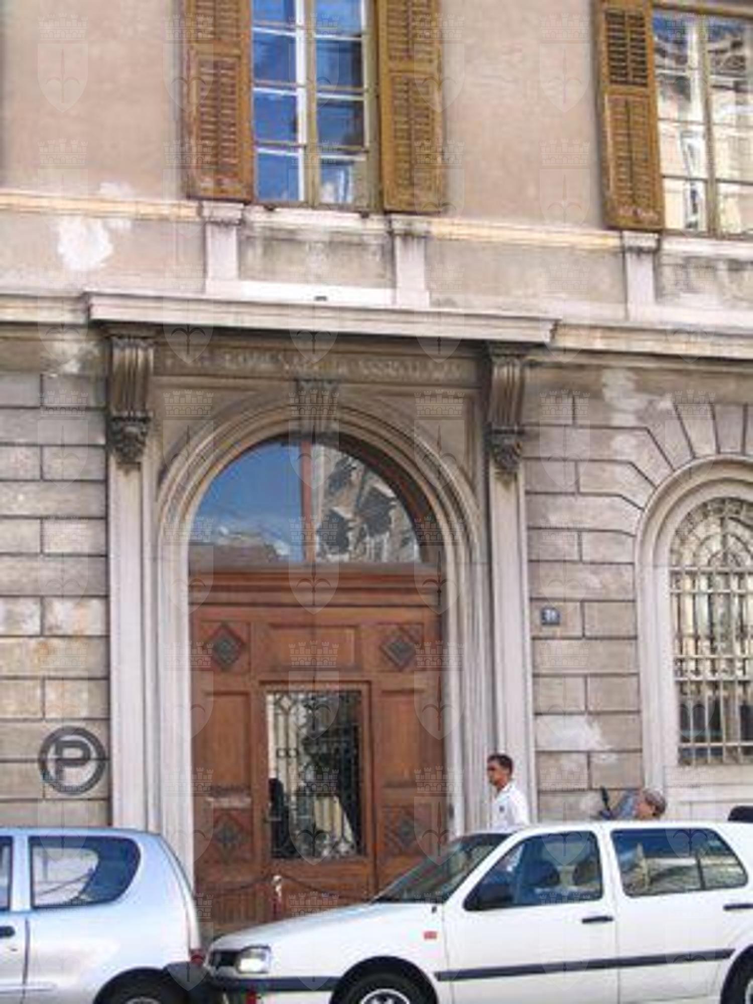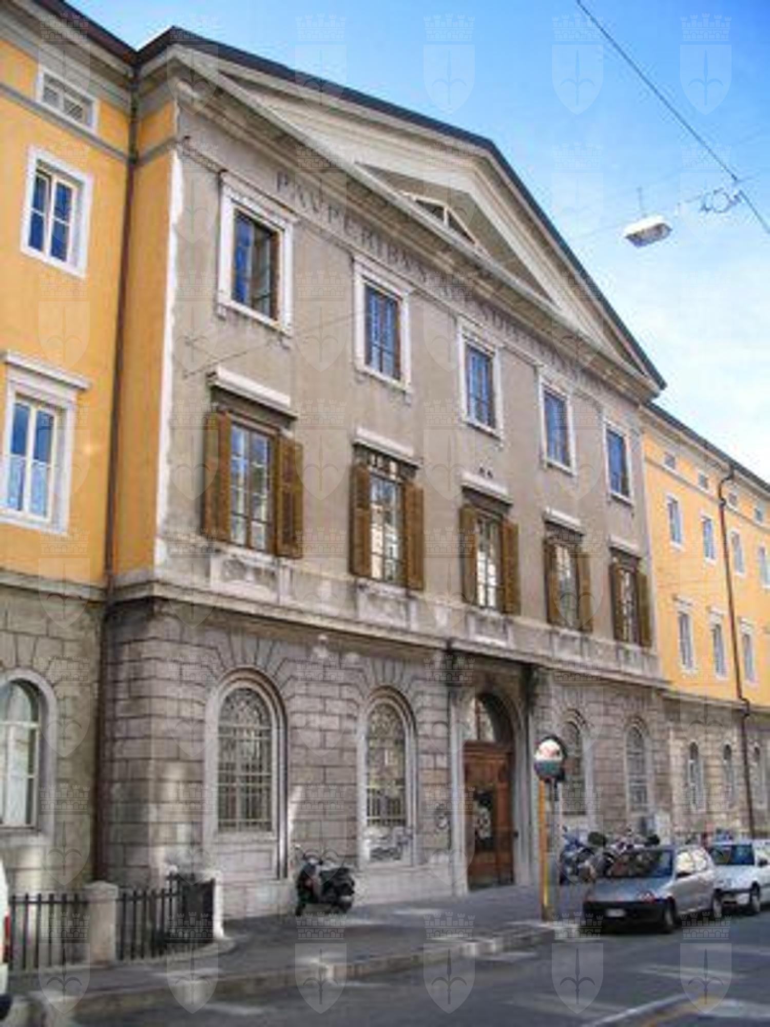 ISCRIZIONE (esterno) Sulla facciata principale è presente l'iscrizione in latino "PAUPERIBUS ALENDIS TUTANDIS". ELEMENTI ORNAMENTALI (esterno) Cartelle decorative sono presenti sotto i davanzali delle finestre al primo piano del corpo centrale. Mensole con decorazione infogliata a sostegno della trabeazione del portale d'ingresso principale. Alabarda in rilievo al centro della facciata.