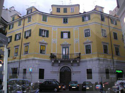 L'immobile si colloca su un lato di una piccola piazza circolare sulla quale si impostano altri due edifici. La struttura a pianta esagonale si sviluppa su quattro livelli fuori terra. La facciata, tripartita, presenta una particolare soluzione angolare in modo da essere interamente visibile dalla piazza, seppure sulla piazza prospetta solamente la parte centrale che, con andamento concavo, ne segue la particolare forma circolare. Al centro del piano terra, caratterizzato da bugnato liscio a fasce orizzontali, si imposta un portone di ispirazione a serliana sovrastato da un balcone che segue l'andamento concavo della facciata. Esso è sostenuto da quattro mensole Sul balcone si innestano due lesene di ordine gigante decorate da medaglioni floreali che tripartiscono la parte centrale della facciata, terminando sulla fascia marcapiano che separa il mezzanino. Le tre aperture centrali del piano nobile sono coronate da cimasa infogliata. Le facciate laterali dell'edificio sono risolte con maggiore semplicità, pur mantenendo i marcapiani pronunciati. Le finestre del piano nobile delle parti laterali sono sormontate da cimasa rettilinea aggettante. Sul tetto sorge un'ampia mansarda, concava, affiancata da altre due, più piccole, in corrispondenza dei bracci laterali dell'edificio. La superficie dell'intero fabbricato, ad esclusione del pianoterra, è trattato ad intonaco di colore giallo.