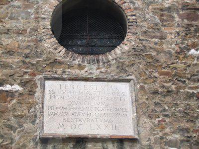 LAPIDE (esterno) Lapide posta dai Gesuiti nel 1672 recitante " TERGESTVM SS. EVPHEMIAE ET THECLAE NOBIL, VV. ET MM. TERGESTIN. DOMICILIVM PRIMVM TEMPLVM ET CATHEDRALE IMMACVLATAE VIRG. ORATORIVM RESTAVRATVM M.D.C.L.XXII." AFFRESCO (interno) Frammenti di pitture ad affresco trecentesche raffiguranti una scena relativa alla vita dell'imperatore Costantino e una probabile Annunciazione. ROSONE (esterno) Rosone con raggiera ad archi a tutto sesto sulla facciata principale. COLONNE (interno) Colonne in pietra con capitello cubico suddividono le navate interne. PROTIRO (esterno) Protiro romanico in pietra bianca con colonne a sostegno dell'arco a tutto sesto.