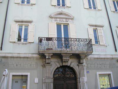BALAUSTRA Il poggiolo presenta una ringhiera in ferro battuto con al centro una corona. MENSOLE Mensole a voluta in pietra sorreggono il balcone del primo piano.