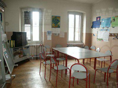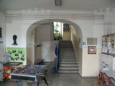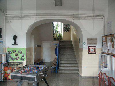 CORPO EDILIZIO PRINCIPALE Un abbassamento in intonaco grezzo protegge l'intonaco liscio di facciata dipinto in color rosso porpora. La facciata principale presenta al piano terra un finto bugnato liscio; paraste lisce rifinite ad intonaco suddividono la facciata in tre parti, mettendo in evidenza la porzione centrale, sovrastata dall'attico; un imponente marcapiano modanato rifinito ad intonaco mette in risalto la ripartizione orizzontale alla quota del solaio del primo piano; il coronamento modanato rifinito ad intonaco si collega senza soluzioni di continuità alla banchina; le lattonerie sono in lamiera verniciata color testa di moro e il manto di copertura si presenta in coppi curvi rossi uso Trieste. I fori architettonici del piano terra, disposti simmetricamente sulla facciata e tutti arcuati, sono collegati a livello dell'architrave da una modanatura ad intonaco posta a correre sulla lunghezza dell'intera facciata; i serramenti vetrati in PVC bianco presentano degli oscuranti metallici esterni verniciati color testa di moro e un sopraluce vetrato protetto da un'inferriata in ferro battuto decorato; la porta lignea a doppia anta di ingresso principale, presenta anch'essa un sopraluce e due specchiature vetrate, protette da inferriate in ferro battuto. I fori architettonici al primo piano, di forma rettangolare e di dimensioni costanti, sono messi in risalto da edicole in pietra bianca con architrave modanato, gocciolatoio sorretto da piccole mensole a voluta e specchiatura trattata ad intonaco bianco posta al di sotto della linea del davanzale, a sua volta messa in evidenza da una modanatura in intonaco posta a correre lungo l'intera dimensione della facciata; i serramenti in PVC a due ante a quattro specchiature con finta inglesina presentano oscuranti esterni ad anta in PVC color testa di moro, ad imitazione degli oscuranti uso Trieste; un balcone in pietra sorretto da quattro mensole decorate a voluta copre la larghezza dei tre fori architettonici centrali e presenta una balaustra in ferro battuto decorato; il foro centrale di porta-finestra di accesso al balcone è messo in evidenza da un timpano triangolare modanato. L'attico presenta tre fori finestra protetti da oscuranti esterni in PVC color testa di moro. I prospetti secondari sono trattati in maniera omogenea ma meno ricca di quello principale, con fori architettonici di dimensioni minori, soprattutto in corrispondenza dei servizi. La pavimentazione in battuto di graniglia e cemento copre tutte le superfici di calpestio del piano terra, mentre al primo piano gli spazi comuni sono pavimentati in marmette di graniglia cemento e le aule presentano un parquet ligneo disposto a spina di pesce. La scala con gradini in pietra bianca bulinata è protetta da una balaustra in ferro battuto decorato con corrimano ligneo. I paramenti murari intonacati color bianco mostrano un abbassamento in smalto murale in color rosa antico, mentre i soffitti nascondono le travature lignee a mezzo del tipico intonaco aggrappato su arelle lignee fissate alla struttura. I serramenti interni sono lignei di grandi dimensioni a doppia anta verniciata in color panna, a tre specchiature cieche. CORPO EDILIZIO SECONDARIO Le facciate sono trattate in maniera omogenea sui quattro lati, ad esclusione del maggior numero di fori presenti sull'affaccio nord-ovest, dove ampie porte-finestre archivoltate si alternano a più piccole finestre. Tutti i fori presentano una cornice ad arco ad intonaco modanata con chiave di volta liscia rifinita ad intonaco. Il paramento murario, le cui dimensioni sono scandite a ritmi regolari da paraste in finti conci ad intonaco grezzo, posti in corrispondenza delle strutture verticali in calcestruzzo armato, presentano un tamponamento esterno in laterizio facciavista e un basamento in intonaco grezzo che protegge il paramento murario dagli agenti atmosferici. La banchina trattata ad intonaco supporta lattonerie in lamiera verniciata color testa di moro. Il manto della copertura a falde è composto da coppi curvi rossi uso Trieste.