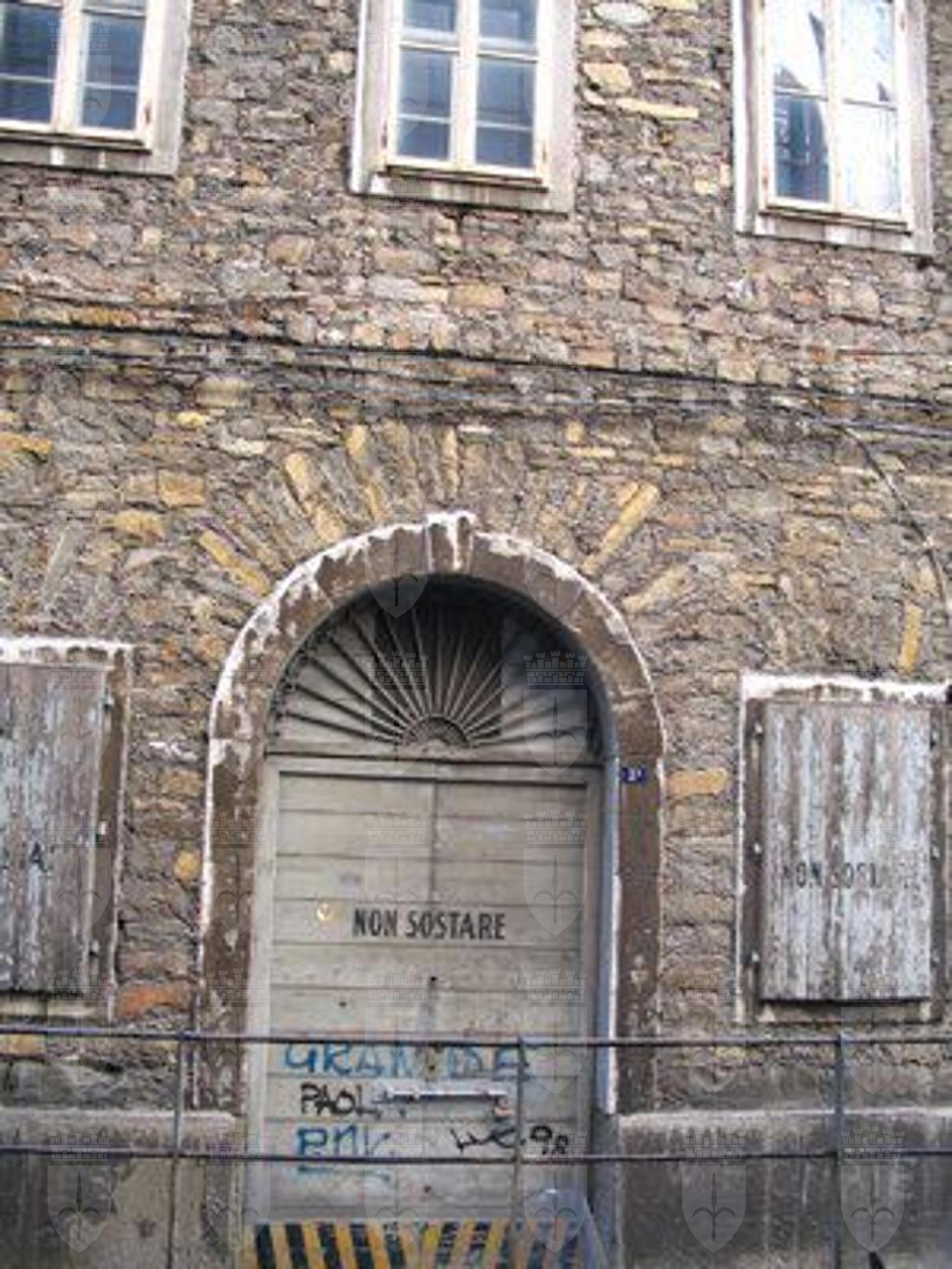CORNICE (esterno): Cornice lineare in pietra a decorazione delle finestre dei piani superiori del prospetto su Via degli artisti. CORNICE (esterno): Cornice costituita da elementi in pietra disposti a fasce che girano a raggiera sui fori del pianoterra. ABBAINI (esterno): Abbaino centrale più grande affiancato simmetricamente da quattro ulteriori abbaini a coronamento del prospetto.
