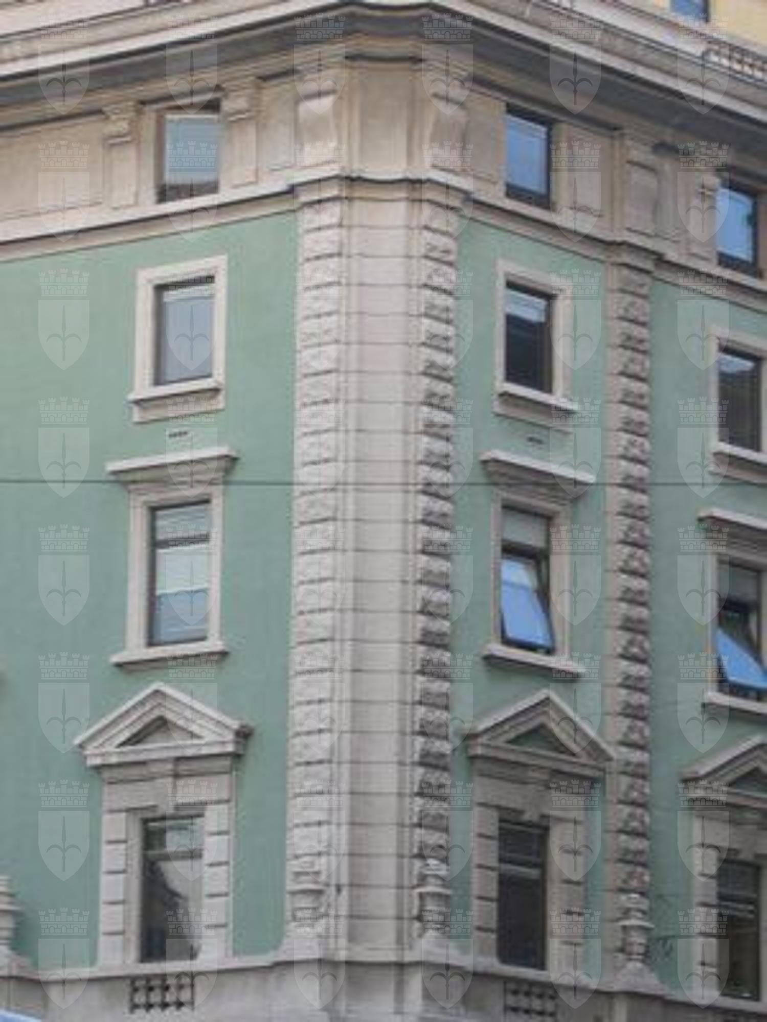 L'immobile, a pianta trapezoidale, è costituito da sette livelli fuori terra. Affaccio principale su Piazza Guglielmo Oberdan, secondari su Via Cesare Beccarla e Via Giustiniano. Primo e secondo piano presentano un rivestimento a bugnato, mentre la superficie muraria superiore è trattata ad intonaco di colore verde fino al quinto livello, di colore giallo all'ultimo piano. Gli angoli dell'immobile sono enfatizzati da un rivestimento a bugnato rustico ripreso nella struttura porticata del pianoterra. Il prospetto principale, caratterizzato da un andamento elittico, presenta al pianoterra un portico ad archi a tutto centro sostenuti da pilastri a bugnato rustico. Tale ambiente ingloba due livelli caratterizzati da aperture rettangolari e dal portone d'ingresso principale. Il terzo piano presenta un balcone centrale balaustrato su cui si apre una porta finestra ad arco a tutto centro con mensola in chiave di volta, inquadrata da una struttura formata da semipilastri a conci di pietra con capitello ionico e trabeazione, che continua nella cornice della finestra superiore. Le aperture laterali sono arricchite da una finta balaustra in pietra e riquadratura a bugnato che sostiene una trabeazione conclusa da frontone. Tale struttura caratterizza anche le finestre al terzo piano delle facciate laterali. Il quarto piano è articolato da una serie di finestre arricchite da cimasa lineare in pietra. Tra quinto e sesto piano corre una cornice marcapiano in pietra che sostiene coppie di mensole a voluta che inquadrano piccole finestre. L'ultimo piano è arricchito da una terrazza a balaustra su cui si aprono semplici aperture rettangolari.