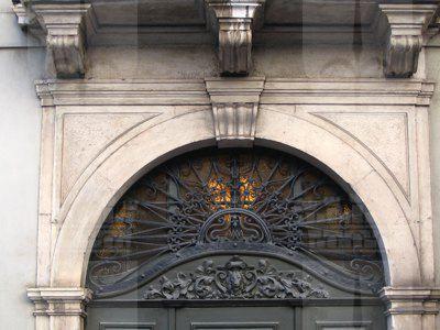 BALCONE (esterno) Balcone con ringhiera in ferro battuto. MENSOLE (esterno) Tre mensole a voluta sostengono il balcone del primo piano.