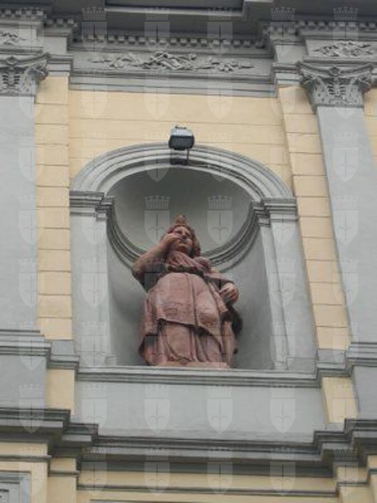 FREGI (esterno): Fregi a rilievo con decorazioni a motivi vegetali e geometrici in corrispondenza delle lunette e architrave delle finestre e della trabeazione del secondo e terzo livello fuori terra. LESENE (esterno): Lesene con capitello ionico e decorazioni a rilevo con motivi floreali in corrispondenza del secondo e terzo piano fuori terra. GHIRLANDE (esterno): Ghirlande a rilievo nelle specchiature inferiori alla veranda del terzo piano del prospetto su Via Enea Silvio Piccolomini. COLONNE (esterno): Colonne di rodine gigante su alto basamento con capitello ionico in corrispondenza dell'ingresso sul prospetto di Via Enea Silvio Piccolomini. STATUE (esterno): Coppia di statue in terracotta raffiguranti figure femminili in corrispondenza delle nicchie laterali alla veranda al terzo piano del prospetto di Via Enea Silvio Piccolomini.