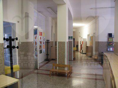 Lo schema compositivo di facciata presenta una fascia basamentale in pietra artificiale di protezione della muratura perimetrale dagli agenti atmosferici; il suo limite superiore segna il livello del piano terra rialzato, raggiungibile a mezzo di una breve scalinata esterna in pietra; sul rivestimento basamentale si aprono le finestre del piano seminterrato, in alluminio laccato bianco a tre ante, con inferriata metallica di protezione. Le restanti porzioni di facciata risultano semplicemente intonacate in color ocra. I serramenti di finestra al piano terra, a tre ante con sopraluce in alluminio laccato bianco, con avvolgibile esterno, sono riquadrati da sottili cornici in pietra naturale. Il portale vetrato di accesso è realizzato in legno massello verniciato naturale a due ante con sopraluce; semplici inferriate in ferro battuto proteggono le specchiature vetrate. Una spessa cornice in pietra bianca modanata segna l'ingresso principale. A livello del primo piano un profondo terrazzo si estende per tutta la lunghezza della facciata principale, con porte-finestra protette da avvolgibili esterni e da tende parasole ripiegabili. Un parapetto metallico verniciato a bacchette verticali corre lungo l'intero perimetro della terrazza. In corrispondenza degli estremi dell'edificio, la facciata arretra per lasciare maggior spazio alla terrazza. Il coronamento dell'edificio è completato da uno sporto di linda, rifinito da una scossalina metallica verniciata in colore grigio. Sul fronte nord i fori finestra si riducono di dimensioni e presentano alternativamente serramenti a doppia anta e serramenti ad anta singola con sopraluce, sempre protetti da avvolgibili esterni e incorniciati da sottili lastre in pietra. Internamente i pavimenti degli spazi comuni sono rifiniti in battuto di graniglia e cemento colorato. I serramenti di separazione dei corridoi e delle aule, di ampie dimensioni, coprenti l'intera altezza libera di interpiano, sono del tipo vetrato in legno verniciato in colore bianco. Le superfici murarie presentano un abbassamento in mosaico color ocra, mentre le parti restanti sono semplicemente intonacate in colore bianco. Il vano scala, del tipo appoggiato a due rampe, è rifinito con pedate in pietra di aurisina; il parapetto pieno rivestito in marmo di Aurisina è completato da un corrimano in acciaio inox posto a correre. Il pavimento delle aule è in pvc, mentre la pavimentazione della terrazza è composta da quadroni in agglomerato cementizio. Al piano interrato i pavimenti sono rifiniti in piastrelle di ceramica.