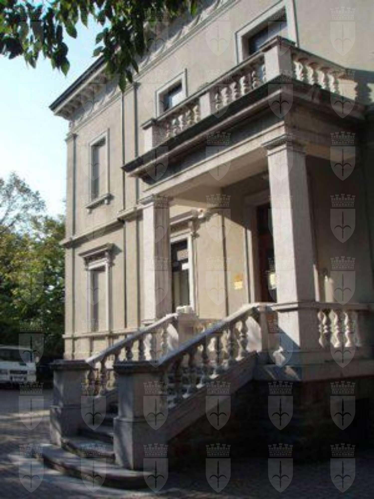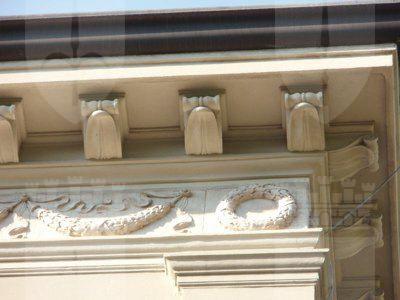 STEMMA Al centro della grata metallica del sopraluce del portone d'ingresso vi sono due iniziali in ferro "JP". CORNICE Sotto la linea di gronda, lungo tutto il perimetro dell'edificio, si sviluppa una fascia con decorazioni lapidee in rilievo, raffiguranti ghirlande, elementi vegetali e nastri.