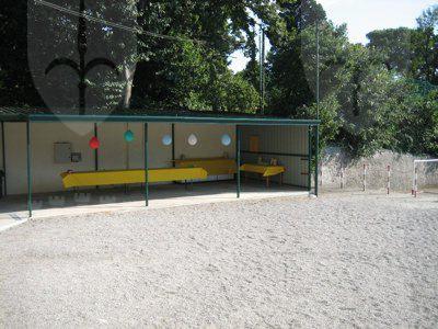 Edificio isolato che si sviluppa su due livelli fuori terra con struttura portante in arenaria a vista, solai in laterocemento e copertura a 4 falde inclinate con abbaini. Le facciate presentano un basamento in pietra con rivestimento in intonaco bugnato bianco, una fascia marcapiano e una cornice, che corrono lungo tutto il perimetro dell'edificio, aggettanti in pietra arenaria rivestita in intonaco bianco. Pluviali esterni alla muratura in pvc su tutti gli affacci con grondaia in metallo verniciato. Le apertura sono regolari con cornici in pietra bianca e serramenti in pvc bianco. Le aree esterne si sviluppano su due diversi livelli e presentano una pavimentazione composta da un marciapiede in cemento con gradini in prossimità degli ingressi; il giardino è in ghiaia ed ospita una piccola tettoia con struttura metallica, mentre le aree attrezzate per i giochi all'aperto sono in battuto di cemento. L'intera area è delimitata da una recinzione metallica e l'ingresso sul lato strada presenta un portone metallico verniciato di color verde. La facciata che si apre sul lato strada presenta al primo livello un piccolo terrazzo centrale con mensole laterali e ringhiera metallica. La facciata opposta presenta un rivestimento in intonaco di color verde scuro. L'interno presenta al piano terra un rivestimento in piastrelle ceramiche di color ocra, pareti con tinteggiatura bianca e porte lignee a due battenti verniciate di bianco.