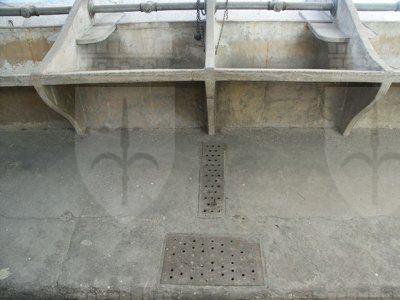 La facciata prospettante la Via San Giacomo, dallo stile tardo eclettico di fine secolo XIX-inizio secolo XX, pur costituendo un semplice muro di recinzione, è trattata come un elemento architettonico separatore tra interno ed esterno. Il ritmo della composizione è scandito verticalmente da coppie di paraste trattate ad intonaco, che salgono dal basamento ad intonaco grezzo sino al coronamento modanato. Lo sporto di linda è sorretto apparentemente da finte mensole in intonaco e sottolineato dal cromatismo grigio in contrasto con il colore brillante della facciata, semplicemente intonacata liscia e dipinta in colore giallo pastello. I fori architettonici seguono il ritmo delle paraste e sono messi in evidenza da cornici intonacate grigie leggermente incassate rispetto al filo di facciata. I serramenti di accesso sono costituiti da cancellate metalliche verniciate grigie, mentre i serramenti di finestra sono costituiti da infissi lignei verniciati grigi con inferriate metalliche decorate di protezione alle ante vetrate. La struttura portante della copertura è costituita da colonnine in ghisa con capitello e giunto bullonato in corrispondenza dell'appoggio dell'architrave e da un secondo ordine di travature ortogonali a quella di bordo, sistemate in appoggio alla muratura costituente la facciata perimetrale. Il manto in lamiera convoglia con poca pendenza le acque piovane in gronde e pluviali metallici verniciati. Sotto la protezione della tettoia le attrezzature in pietra artificiale del lavatoio costituiscono due lunghe file di vasche complete di mensole per l'appoggio del sapone e delle tubature per il convogliamento dell'acqua. A terra permane l'antico sistema di caditoie per la raccolta dell'acqua rovesciata al di fuori delle vasche stesse. Sul lato est un alto muro in pietra arenaria facciavista delimita lo spazio di pertinenza del lavatoio, semplicemente pavimentato in lastre di cemento gettate in opera.