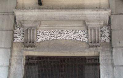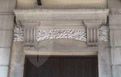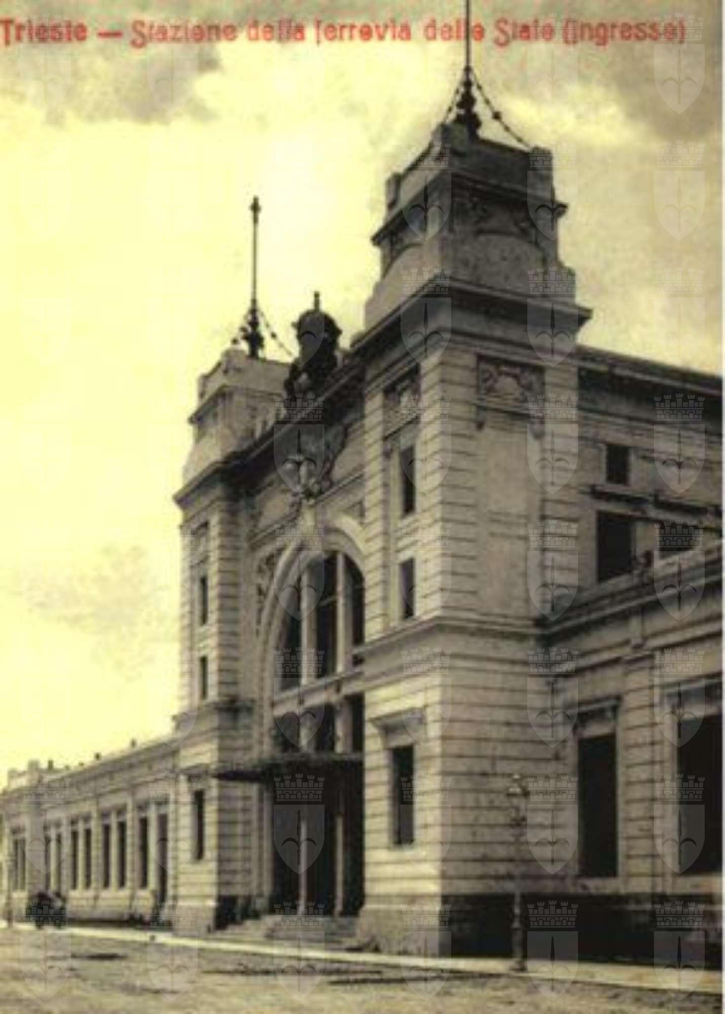 ELEMENTI ORNAMENTALI (esterno) Sopra all'ingresso principale è collocato un elemento scultoreo in stucco a rilievo raffigurante una ruota fiancheggiata da due ali, a simboleggiare la Ferrovia. Una cornice decorativa con ovuli e motivi geometrici circonda l'arco dell'ingresso. Alcune finestre del piano terra sono ingentilite da fregi vegetali scolpiti. MENSOLE( esterno) Mensoline a voluta sostengono i frontoni delle finestre. Mensole semplici a sostegno dello sporto di linda. STEMMI(esterno) Ai lati dell'arco d'ingresso sono presenti due stemmi incorniciati da volute vegetali raffiguranti, uno l'alabarda di Trieste e uno lo stemma sabaudo.
