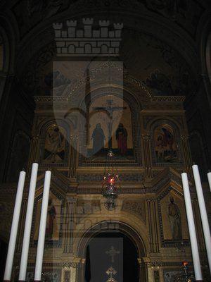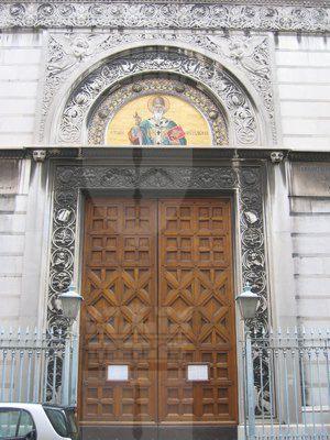 AFFRESCHI (interno): Affreschi raffiguranti "Cristo Pantocratore" con gli "Angeli reggicartigli" nella cupola centrale, nelle absidi laterali "San Spiridione al concilio di Nicea" e la "Vergine Assunta". Nella superficie superiore dell'ingresso la "Tomba di San Spiridione" e al di sopra delle porte laterali le immagini del "Profeta Elia" e il "San Giovanni Battista". I rimanenti mosaici della facciata principale rappresentano i "Quattro Evangelisti" e il "Padre Eterno". ICONOSTASI (interno): Iconostasi formata da dipinti raffiguranti la "Crocefissione" al centro ed ai lati la "Resurrezione" e il "Battesimo di Cristo". A completamento della struttura si trovano quattro icone che rappresentano "San Spiridione, la "Vergine col Bambino", "Cristo Re" e l'"Annunciazione". MOSAICI (esterno): Mosaici raffiguranti "San Spiridione" al di sopra dell'ingresso principale, "San Michele Arcangelo" e i "Santi Atanasio" e "Gregorio Nazianzeno" nelle lunette laterali. Sulla parete destra si trovano le raffigurazioni della "Madonna con Bambino" e i "Santi Basilio" e "Giovanni Crisostomo". I mosaici rimanenti rappresentano teorie di santi. SCULTURE (esterno): Statue di "Santi" a decorazione delle nicchie della facciata principale.