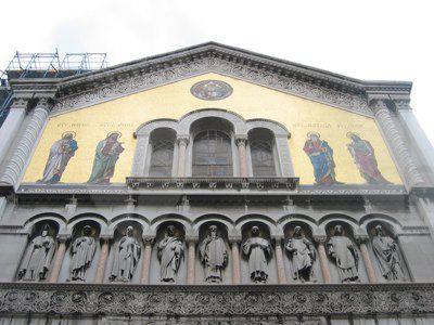 La struttura presenta affaccio principale su Via San Spiridione, affacci secondari su Via Genova e Piazza Sant'Antonio. L'immobile è caratterizzato da pianta a croce greca, di altezza pari a 40 metri, con cupola centrale sostenuta da quattro pennacchi e tre calotte absidali emisferiche che ricoprono tre bracci della croce. L'impianto è completato da quattro campanili di dimensioni ridotte. La copertura è in lamiera verniciata. La decorazione interna è costituita da affreschi su fondo oro di ispirazione bizantina. Al centro della cupola è raffigurato "Cristo Pantocratore" circondato da un cielo stellato, completato nell'archivolto di fronte da due "Angeli reggicartiglio". Nello spazio absidale si dispiegano la narrazione di "San Spiridione al concilio di Nicea" e l'immagine della "Vergine Assunta"; una teoria di "Santi" della Chiesa orientale sono raffigurate nelle pareti laterali. Le lunette interne presentano tre affreschi raffiguranti la "Tomba di San Spiridione", i santi Elia e Giovanni Battista. Nei pennacchi sono rappresentati gli evangelisti. L'iconostasi, a chiusura della zona del presbiterio, è in muratura rivestita di stucco dorato e arricchita da dipinti: al centro nella parte superiore si trova una "Crocefissone" tra le immagini della "Resurrezione" e il "Battesimo di Cristo", mentre nel registro centrale sono affrescati quattro "Santi" della Chiesa serba. La struttura è completata da quattro grandi icone con "San Spiridione", la "Vergine col Bambino", "Cristo Re" e l'"Annunciazione". I prospetti esterni sono caratterizzati dall'uso di pietre diverse, tra cui la pietra delle cave di santa Croce del Carso, quella proveniente dalle isole Brioni d'Istria, marmo di Carrara e marmo rosso di Verona. La facciata principale è decorata da mosaici su fondo oro; nella lunetta è raffigurato il santo protettore della chiesa, nelle nicchie diversi santi e nel timpano gli evangelisti con il Padre Eterno. I rimanenti mosaici rappresentano teorie di santi contornati da motivi vegetali e simboli diversi.