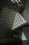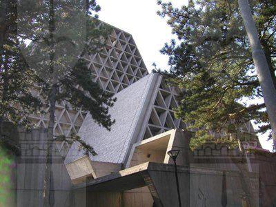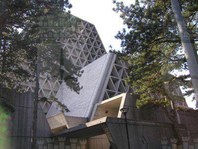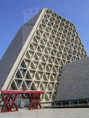 L' architettura del tempio sacro è basata su moduli triangolari rigorosamente calcolati che, ripetendosi nelle stesse proporzioni, compongono non solo la costruzione, ma anche ogni suo singolo arredo. La massa volumetrica è caratterizzata da equilibrio ed armonia e, nonostante la sua imponenza di 48.000 metri cubi, risulta leggera e ariosa, grazie al reticolato delle travi in cemento armato disposte a triangolo che le conferiscono l'aspetto di una trina trasparente. La struttura è costituita da due chiese sovrapposte, l'inferiore e la superiore, entrambe con pianta a croce greca. Le due aule di culto sono collegate tra loro da una scala interna, ma hanno anche ingressi indipendenti. La cella campanaria è costituita da un prisma capovolto che s'incunea nella copertura della campata.