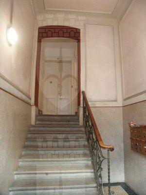 Le facciate composte in maniera uniforme sono suddivise orizzontalmente da ampi marcapiani modanati trattati ad intonaco posti all'altezza del solaio del piano primo, terzo e quinto. La parte basamentale color ocra è trattata a bugnato liscio in intonaco con un abbassamento in pietra bianca bulinata. La parte superiore ad intonaco liscio color porpora presenta paraste ad ordini sovrapposti doriche e corinzie, che evidenziano l'angolo. Basse finestre vetrate con inferriata di protezione e cornice semplice squadrata in pietra bianca danno luce al piano interrato. Il portale di ingresso, a due battenti in legno verniciato naturale, presenta piccoli timpani posti sopra le specchiature vetrate protette da inferrate in ferro battuto; un ampio sopraluce tripartito contribuisce all'illuminazione dell'atrio di ingresso; una cornice modanata contorna il foro architettonico; architrave modanata in pietra bianca, sostenuta da mensole a voluta. A tutti i piani le finestre in legno, color testa di moro a sei specchiature e a doppia anta, presentano oscuri esterni a libro al piano terra, "uso Trieste" ai piani superiori. Al piano terra i fori architettonici sono privi di cornice. Al primo piano è presente un'edicola in pietra bianca con timpano triangolare superiore, sorretto da mensole a voluta e specchiatura sotto-finestra; una semplice modanatura unisce orizzontalmente la linea dei davanzali. Ai piani secondo e quarto le finestre sono incorniciate da semplici elementi in pietra bianca; il davanzale sporgente è sorretto da piccole mensole a voluta. Al terzo piano una semplice modanatura unisce orizzontalmente la linea dei davanzali; la specchiatura sotto-finestra è intonacata nel colore della facciata; una cornice in pietra bianca modanata descrive il perimetro del foro architettonico; l'architrave modanato sporgente superiore in pietra bianca è sorretto da mensole a voluta. Al quinto piano semplici cornici modanate riquadrano le finestre, protette dallo sporto di linda con banchina modanata in pietra bianca. Le facciate prospettanti sul cortile sono semplicemente intonacate in colore bianco. Parapioggia metallici riparano i serramenti delle finestre dagli agenti atmosferici. Gronde in lamiera convogliano le acque piovane in pluviali interni alla muratura. La copertura a falde presenta un manto in coppi curvi rossi. L'atrio di ingresso, da cui sale una breve rampa di accesso al piano terra rialzato, è pavimentato in marmittoni di graniglia e cemento, mentre il rivestimento murario è realizzato in mosaico di colore rosa. Modeste cornici modanate in gesso perimetrano campiture colorate in rosa pastello in corrispondenza delle pareti e del soffitto. Le scale condominiali presentano gradini in pietra bocciardata e parapetto in ferro battuto decorato con corrimano in legno verniciato naturale; la prima rampa sale fino a oltrepassare il muro di spina centrale, il cui foro è dipinto internamente in color porpora. I pianerottoli di piano sono pavimentati in piastrelle ceramiche rosa e nero. I paramenti murari sono intonacati in colore bianco, con abbassamento in color rosa e battipiede ocra a smalto. I serramenti di ingresso agli appartamenti sono lignei a doppi anta trattati a smalto colore noce chiaro, con riquadri in altorilievo e cornice modanata. I serramenti vetrati del vano scala sono in alluminio laccato bianco a doppia anta.